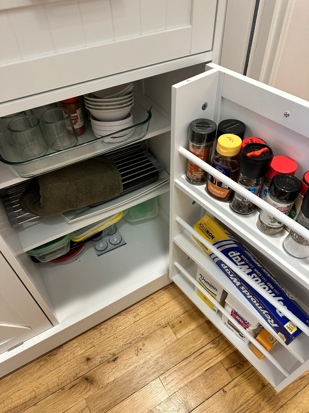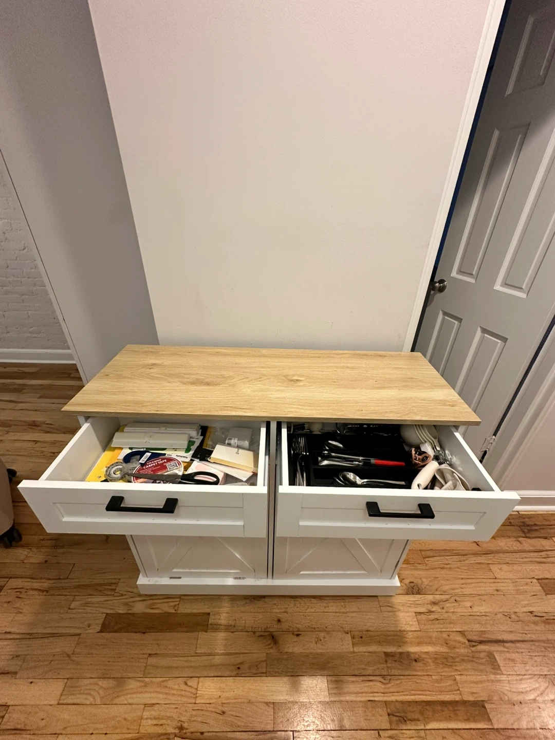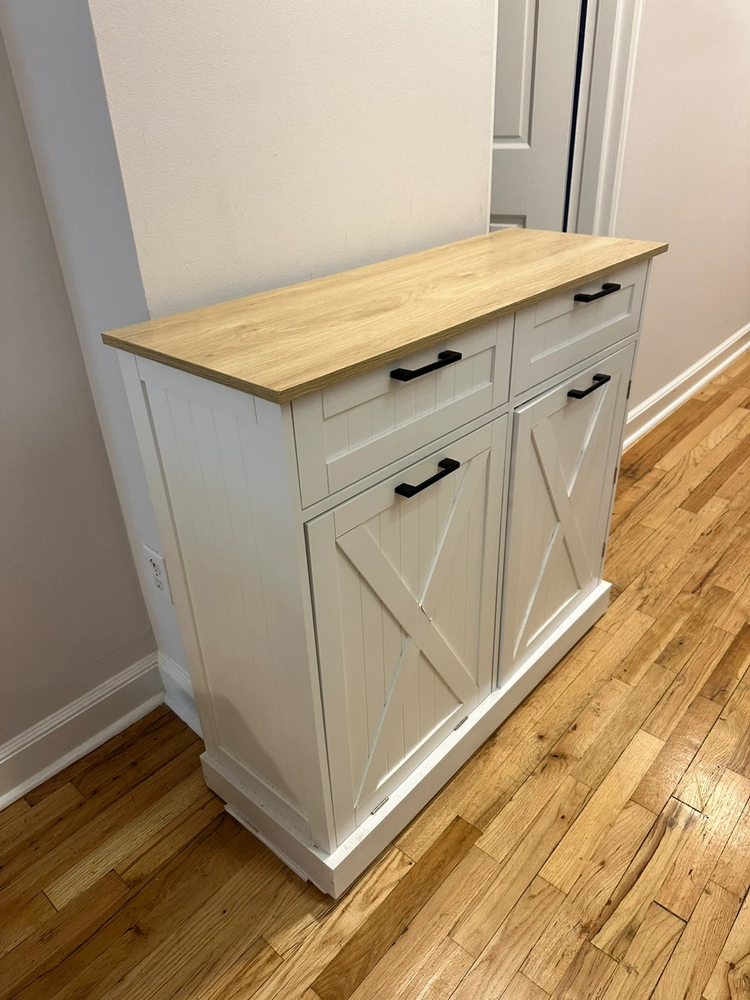 This kitchen island/storage cabinet is perfect for adding extra storage and counter space to your kitchen. It features a white cabinet with an oak-colored top, two drawers, and a tilt-out trash bin. There's also shelving on the side for spices and other kitchen essentials! The dimensions are approximately 39.4" (100 cm) wide, 24" (61 cm) high, and 14.2" (36 cm) deep.