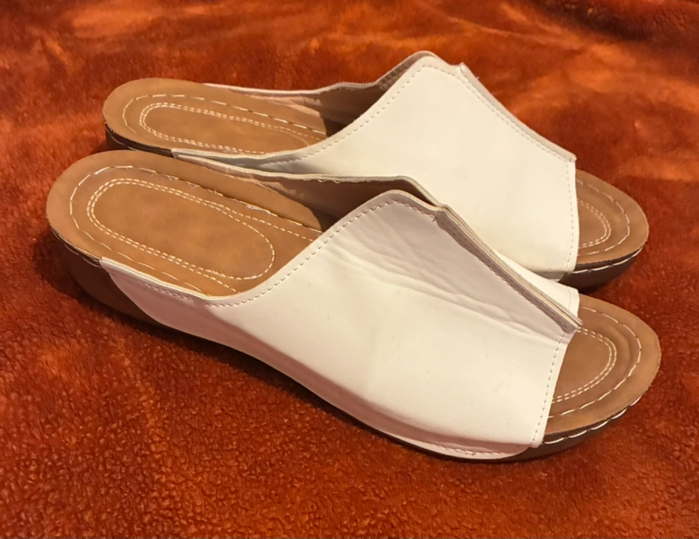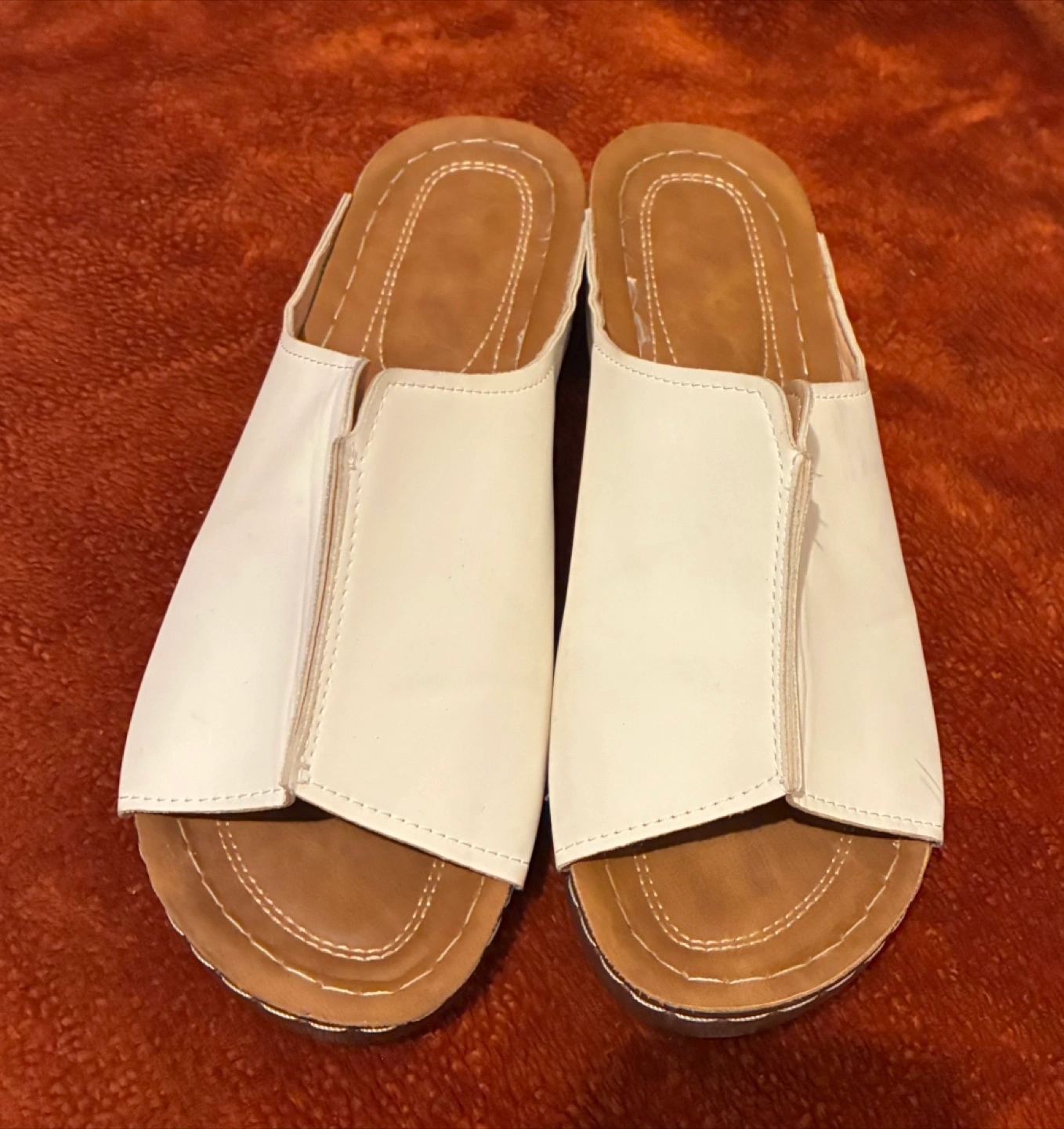 These are a pair of white open toe sandals. They appear to be in good condition and ready for a new home #freecycle