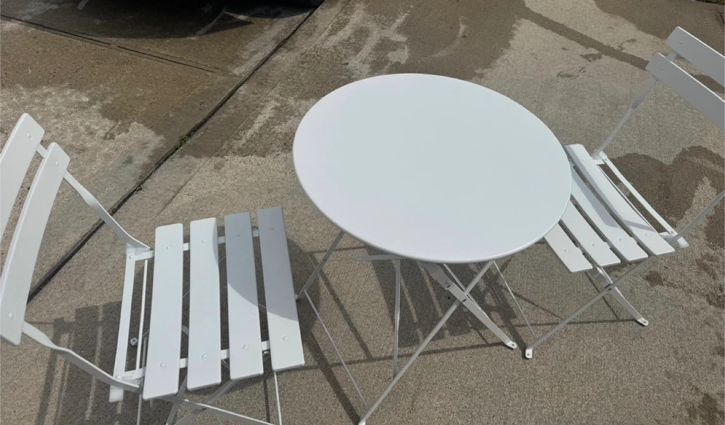 This is a cute white bistro set that includes a table and two chairs! It's perfect for a small patio or balcony. The set is in great condition and ready for a new home