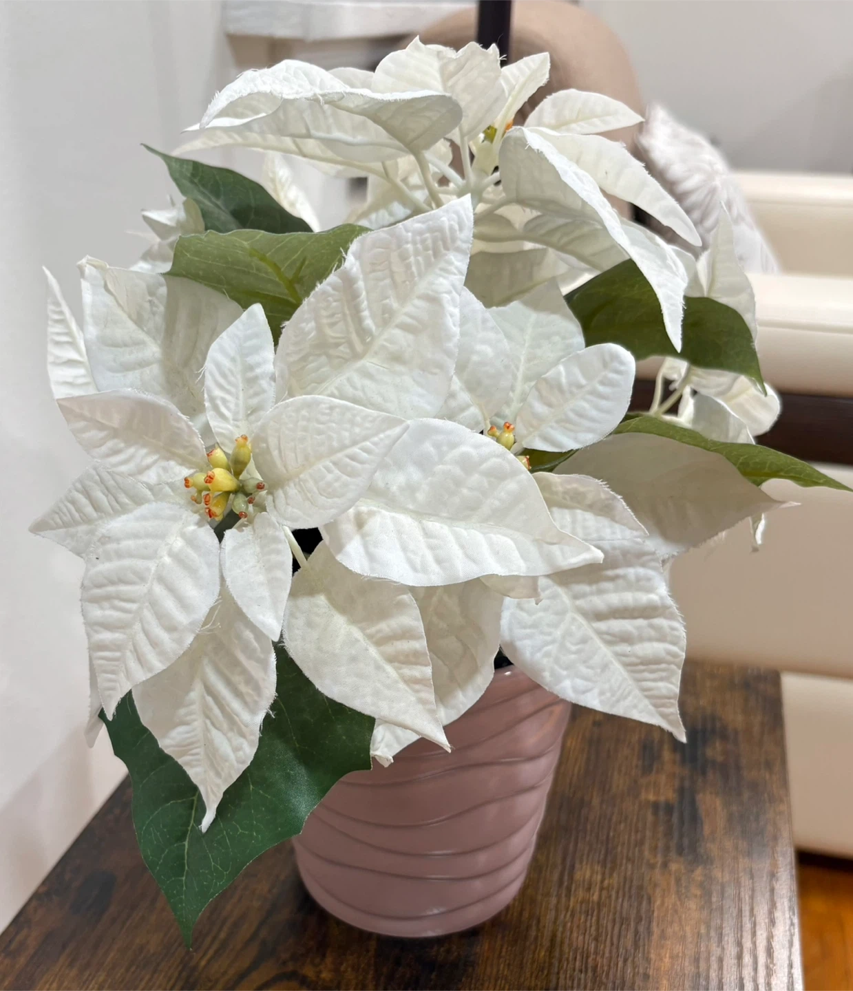 15I'm selling a beautiful white poinsettia in a cute pink pot! It's perfect for adding a touch of elegance to any room. The plant features vibrant green leaves and delicate white bracts, creating a stunning contrast. It's in great condition and ready to brighten up your space!