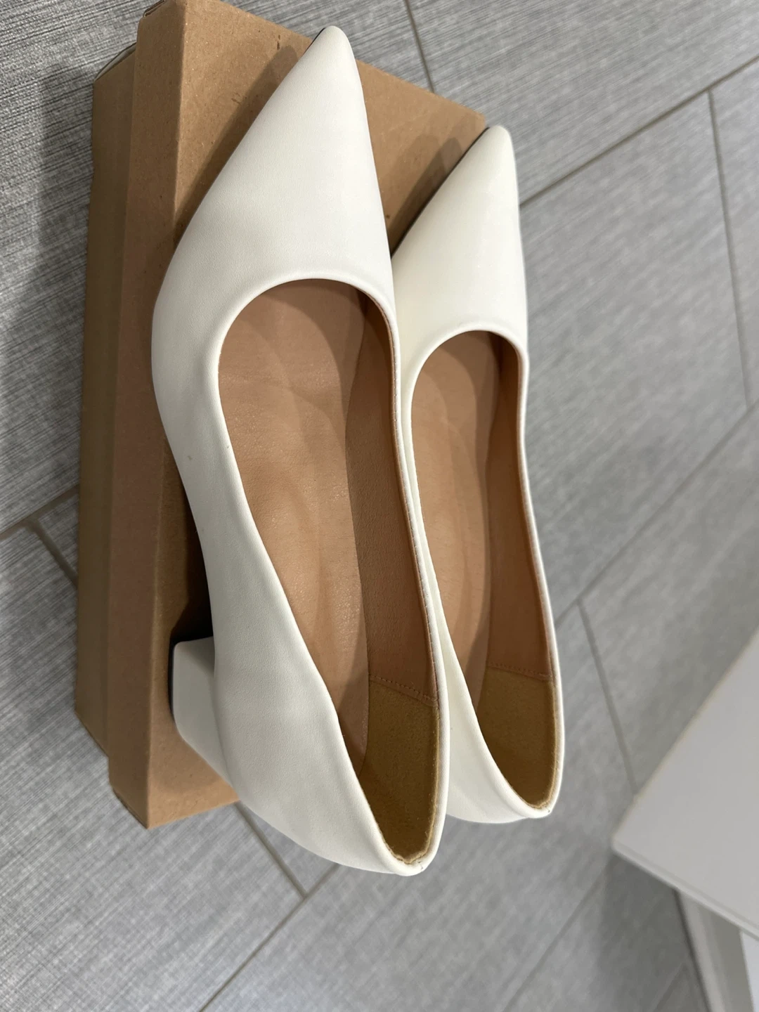 These are a pair of white pointed-toe block heel pumps, perfect for dressing up or down! They come with the original box.