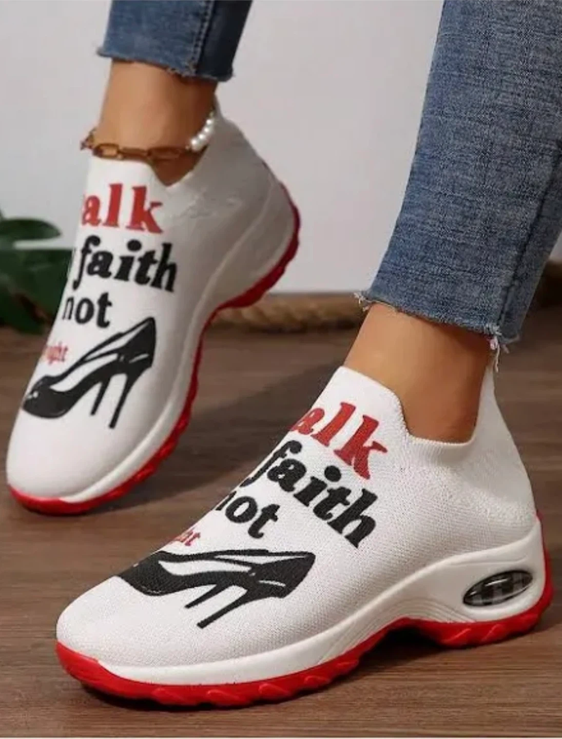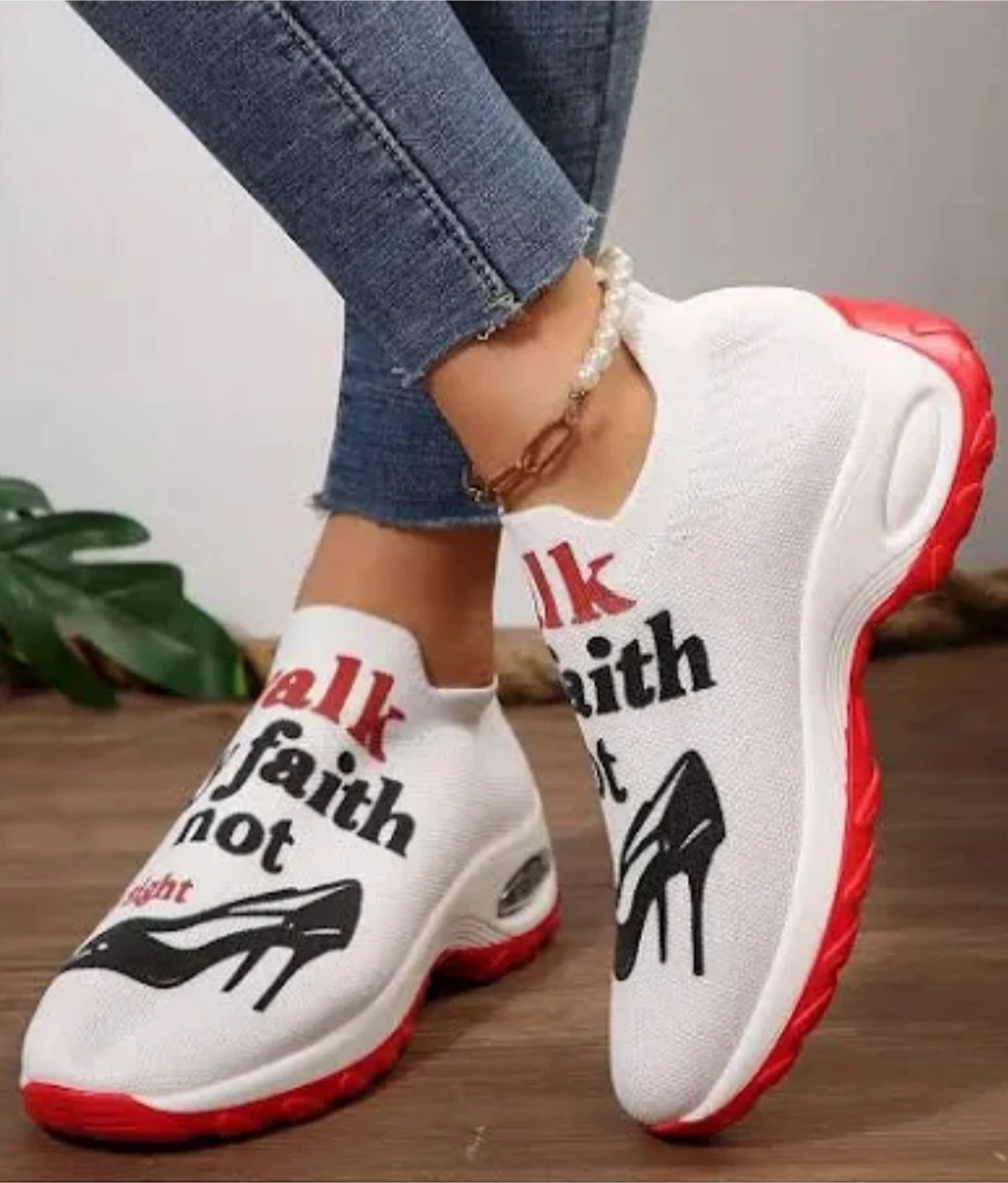 Cute white sneakers with red accents and 'Walk Faith not Sight' printed on the sides! They have a unique design with a high heel shoe graphic. Perfect for casual wear!