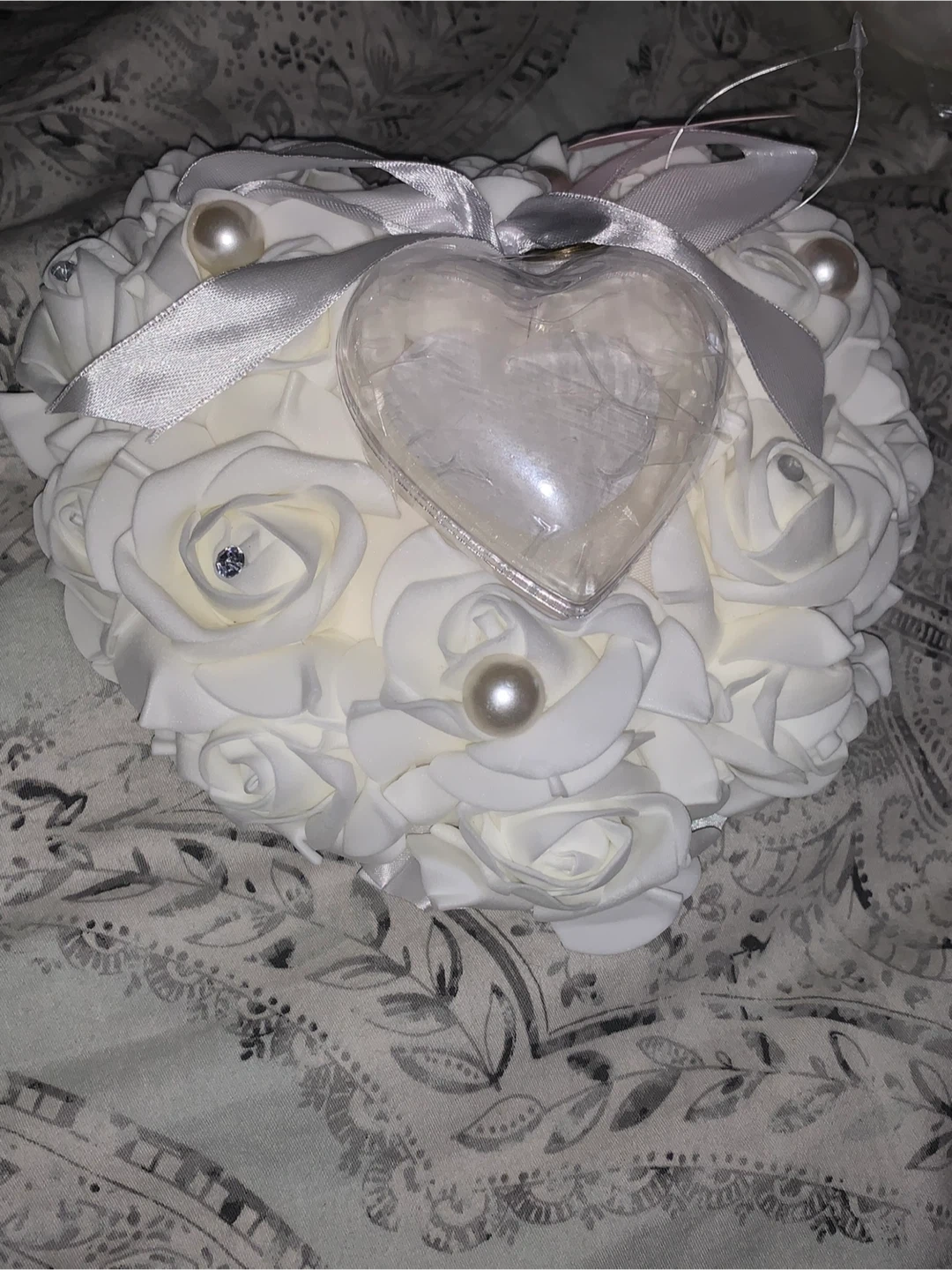 Beautiful white rose bouquet with pearl accents and a heart-shaped centerpiece. Perfect for weddings or home decor! The roses are a soft, elegant white, and the pearls add a touch of sophistication.