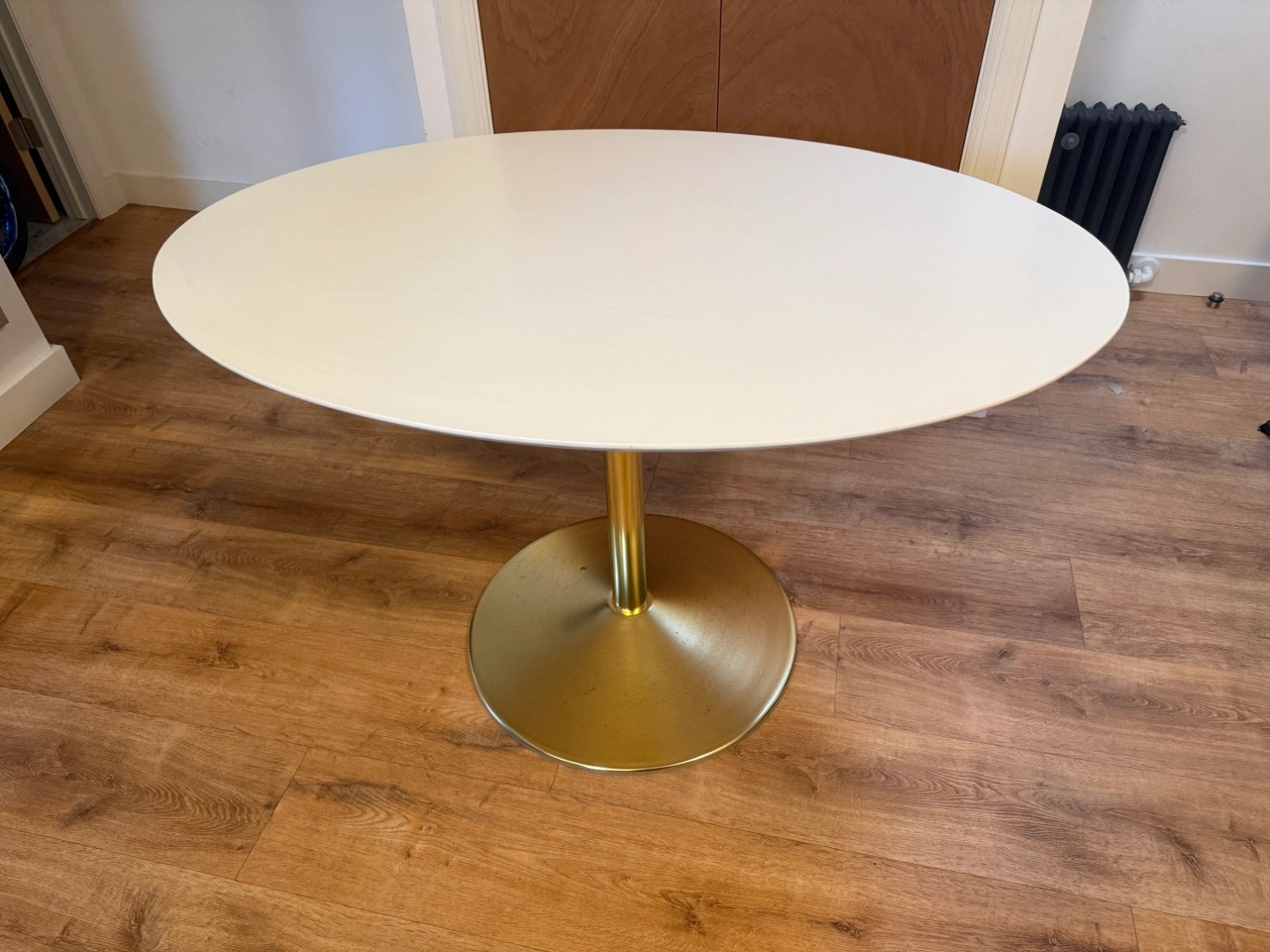 Selling a round dining table featuring a white tabletop and a gold-colored base. It's in good condition and ready to brighten up your dining space! The base shows some signs of wear, but it still looks great