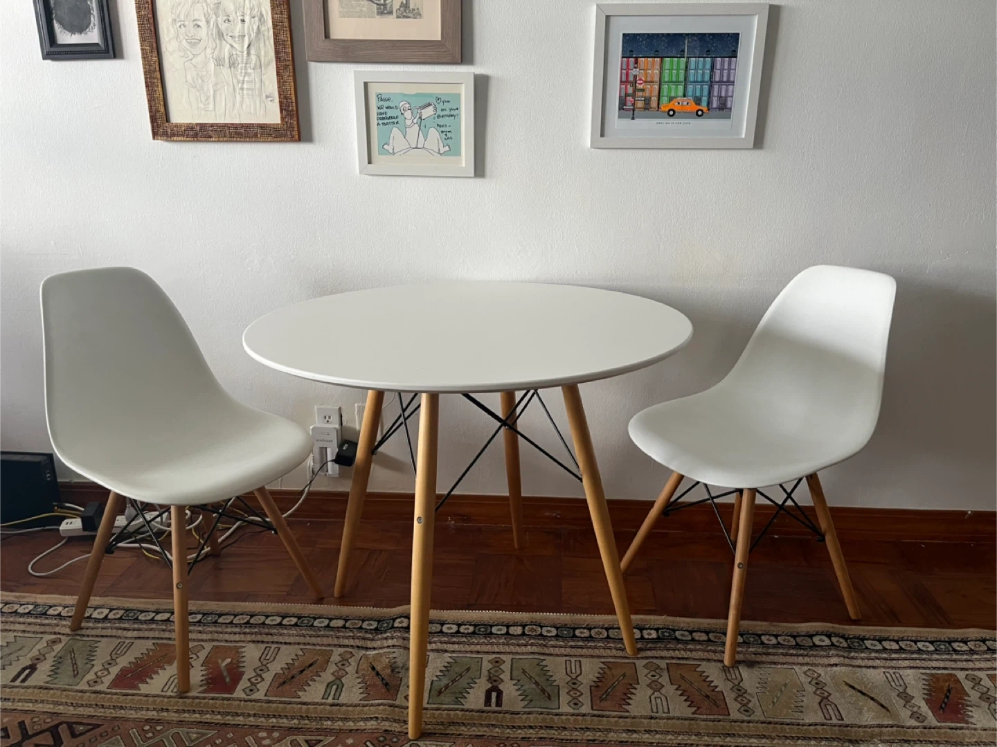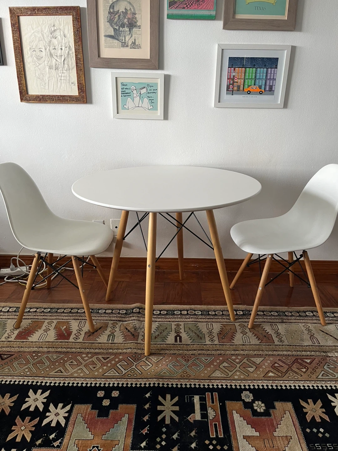Selling a cute white round dining table that comes with two matching chairs! The table has a clean, modern look with wooden legs, and the chairs complement it perfectly. Great for a small dining area or kitchen nook!