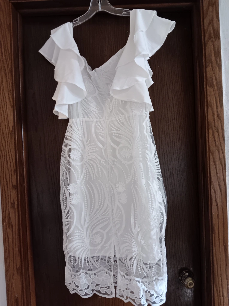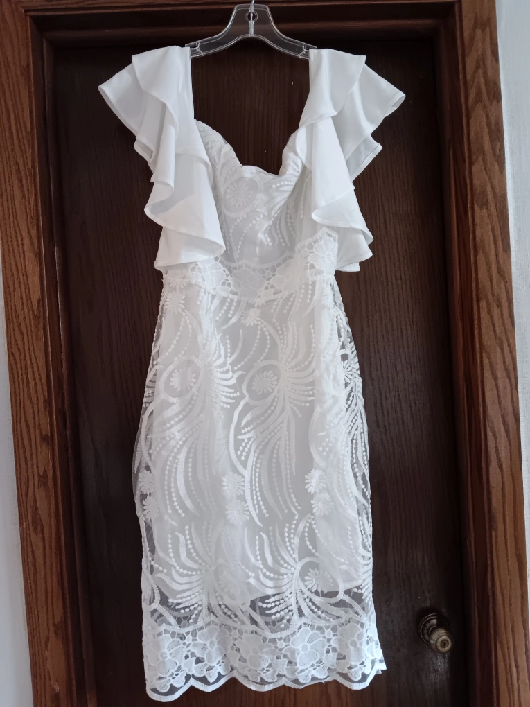 Selling a beautiful white dress with ruffle detailing! The dress features delicate lace and a flattering silhouette. Perfect for a special occasion or a night out. Could be used as a wedding dress or wear to an all white party.