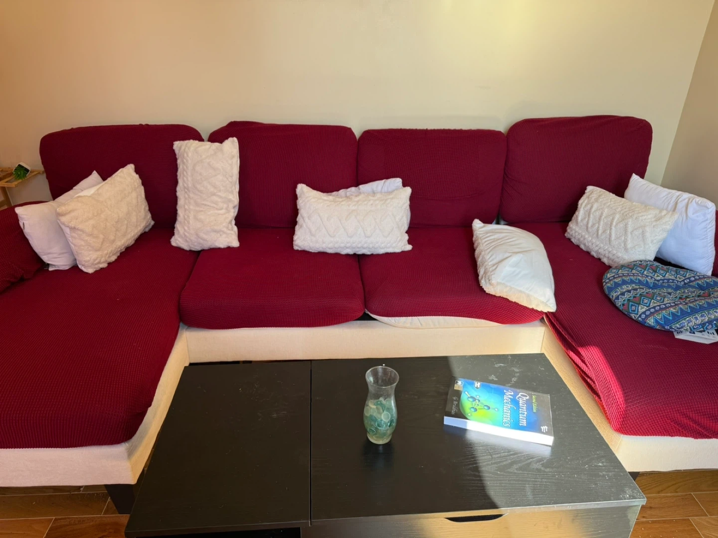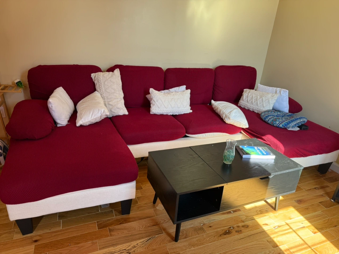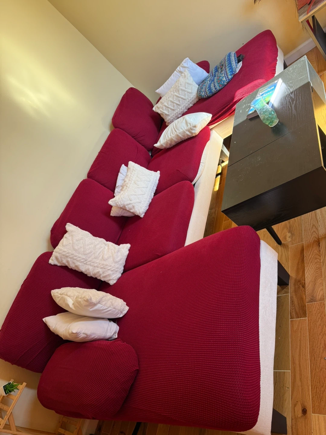 Selling a spacious red sectional sofa. It's perfect for a living room or entertainment area. The sofa comes with several white decorative pillows, adding a touch of comfort and style