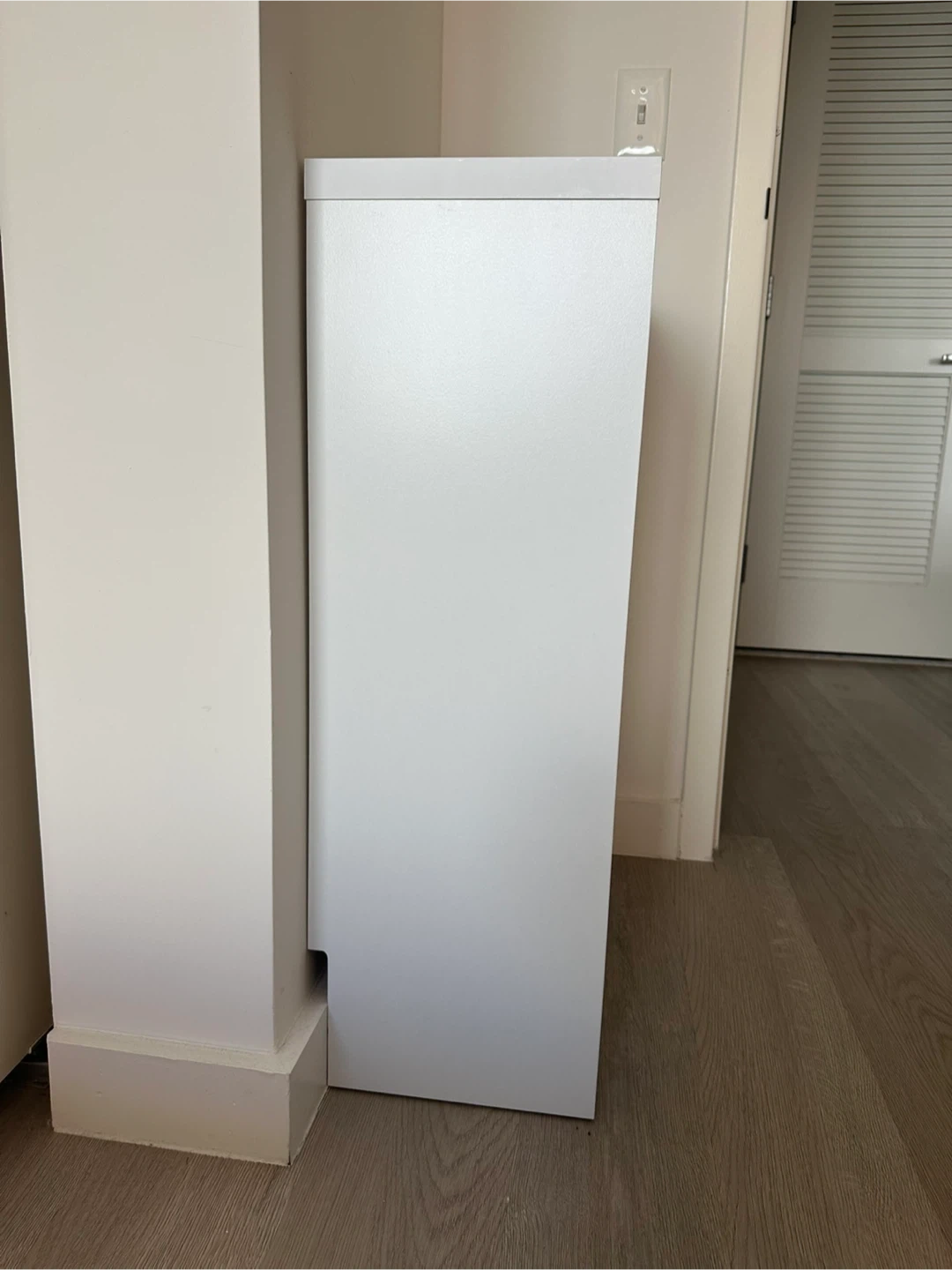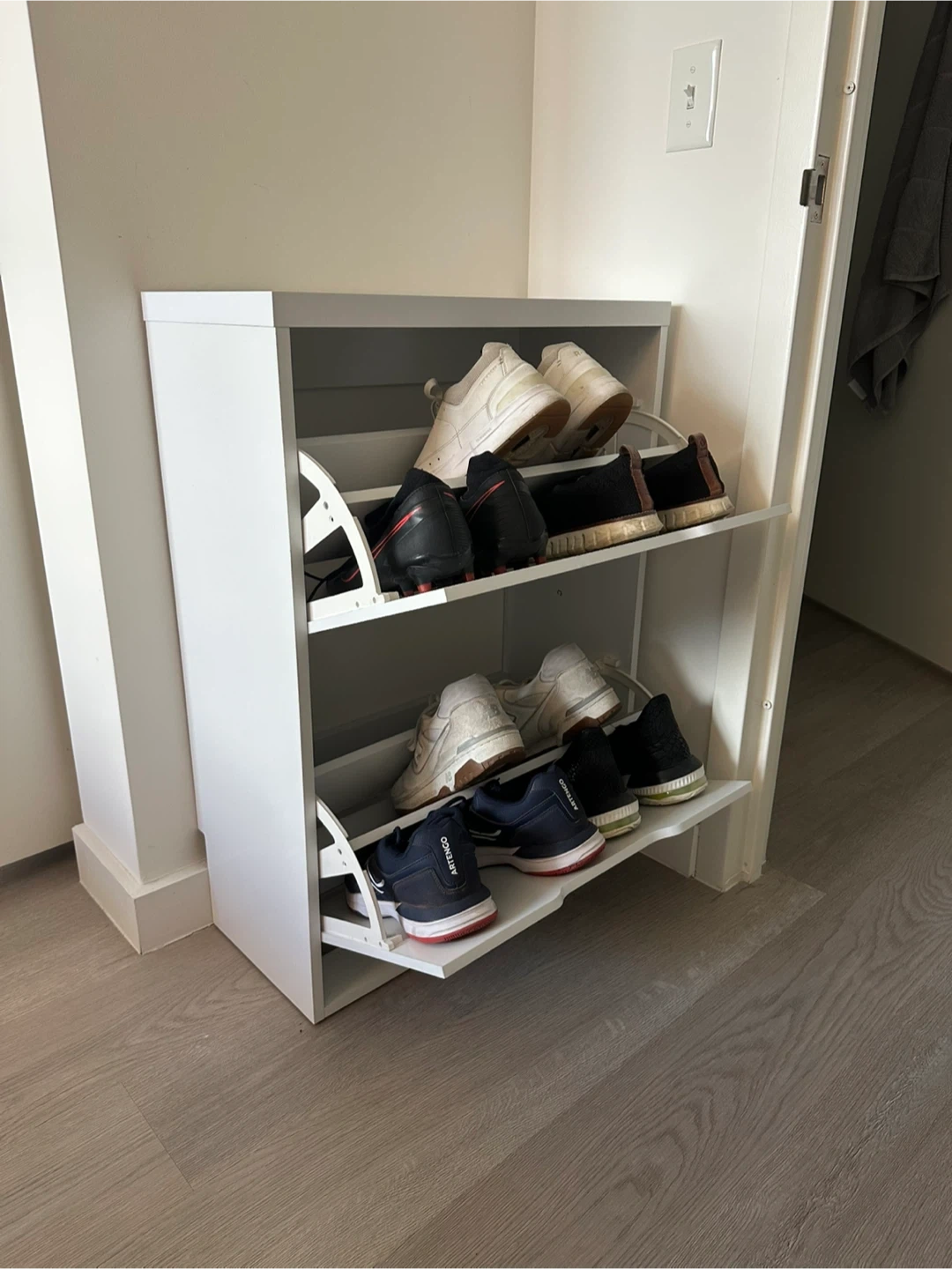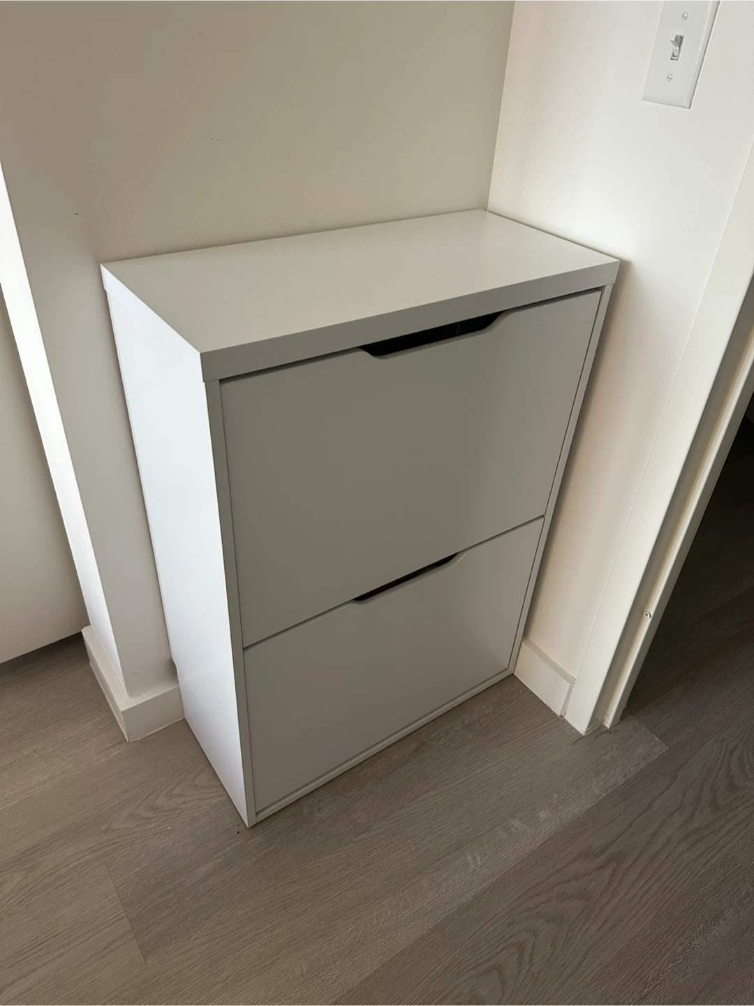 60Selling a white shoe storage cabinet. It's in great condition and perfect for keeping your entryway tidy. It has two shelves for storing shoes.