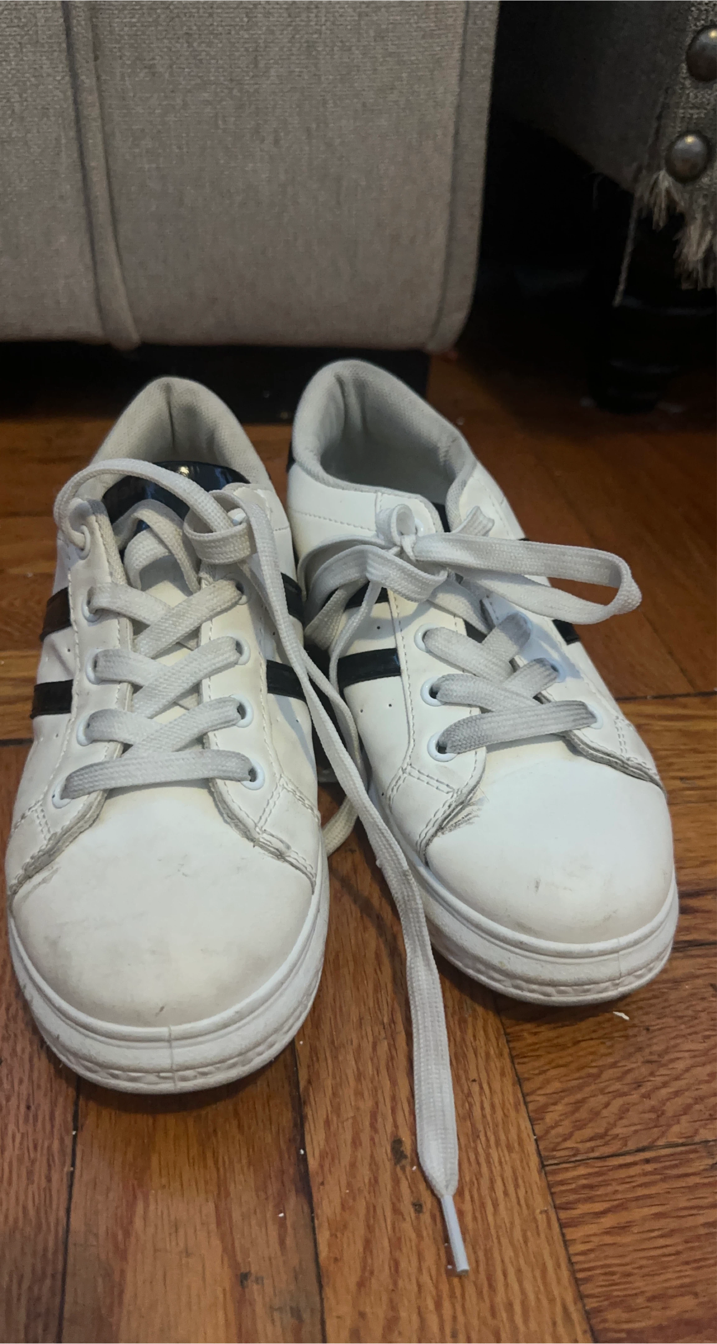 65Selling a pair of white sneakers with black stripes. They show some signs of wear, but still have a lot of life left in them