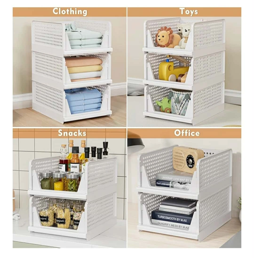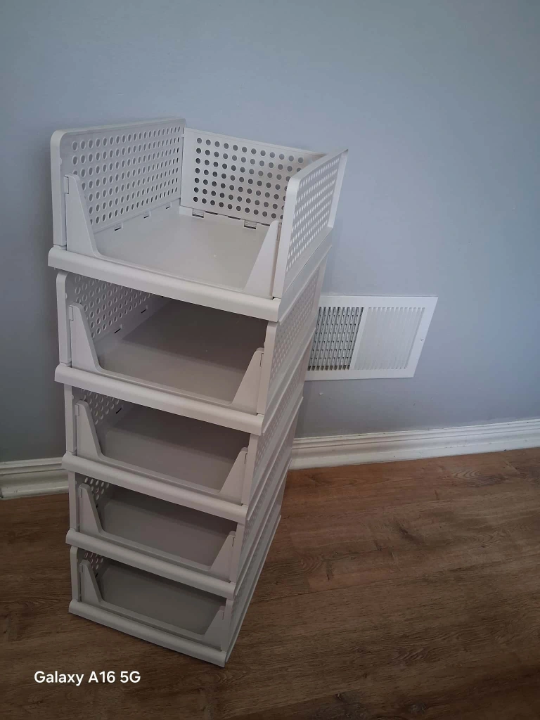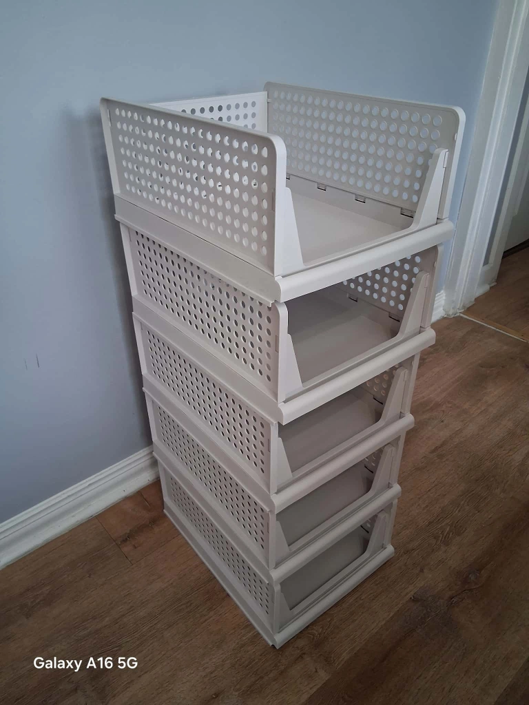 Here are 4 stackable storage baskets in brand new condition! These are perfect for organizing clothing, toys, snacks, or office supplies. They're white and easy to assemble, making them a versatile addition to any room