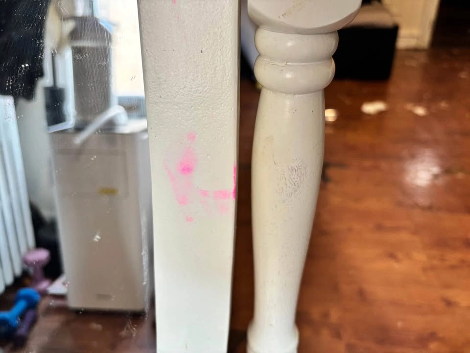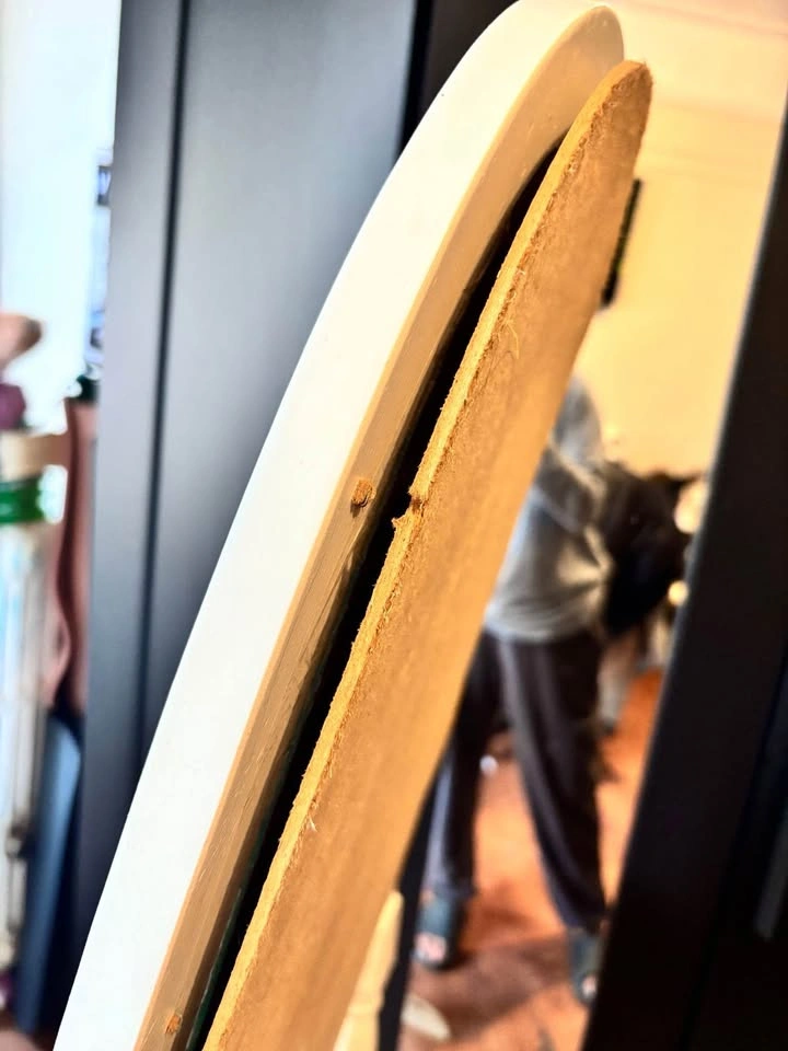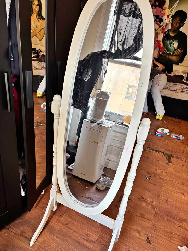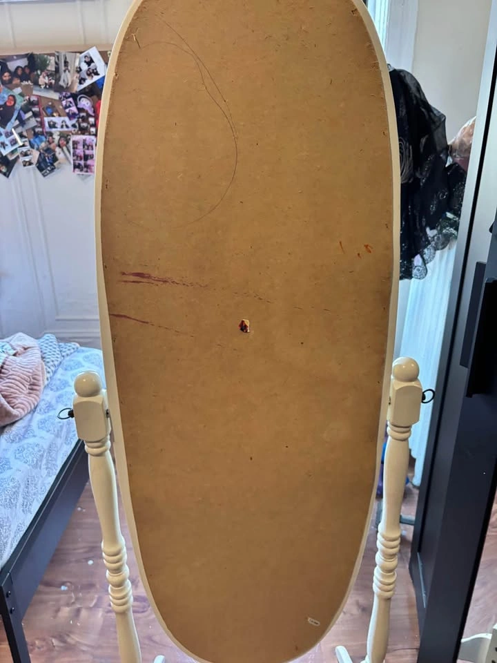 75Open to offers (No trades) White standing oval mirror with some damage on the frame and glass. Has paint chipping off in some areas and marks on the glass. Could use a paint over and some screws to tighten but over a good mirror.