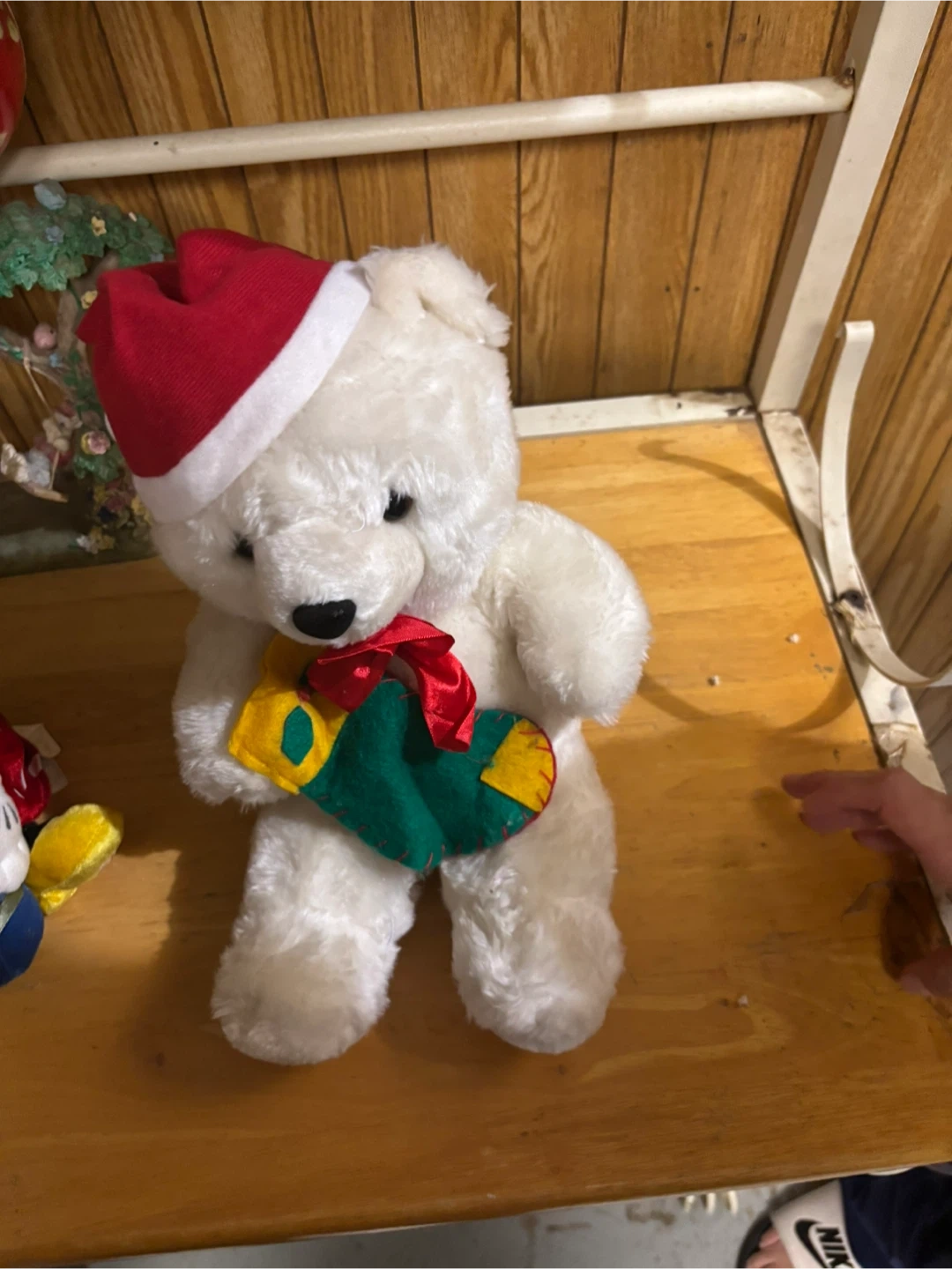 10A cute white teddy bear wearing a Santa hat and holding a stocking. It's in good condition and ready for a new home!