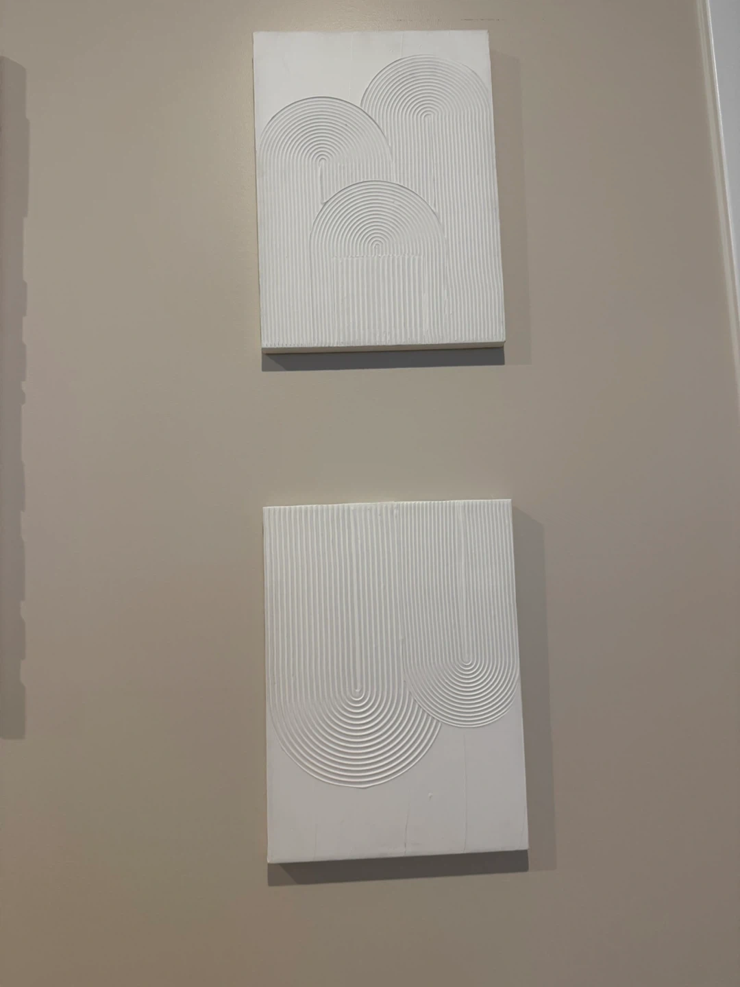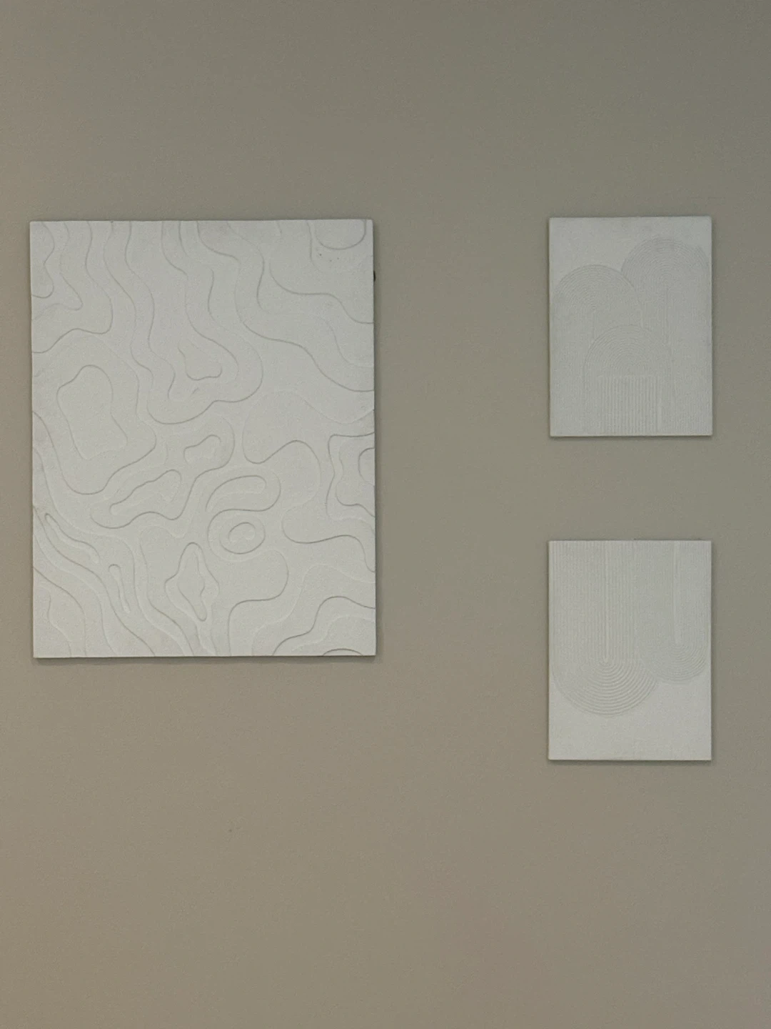 10Selling a set of three textured wall art pieces. They're all white and have unique patterns that add a subtle, modern touch to any room. Perfect for adding some visual interest to your walls!
