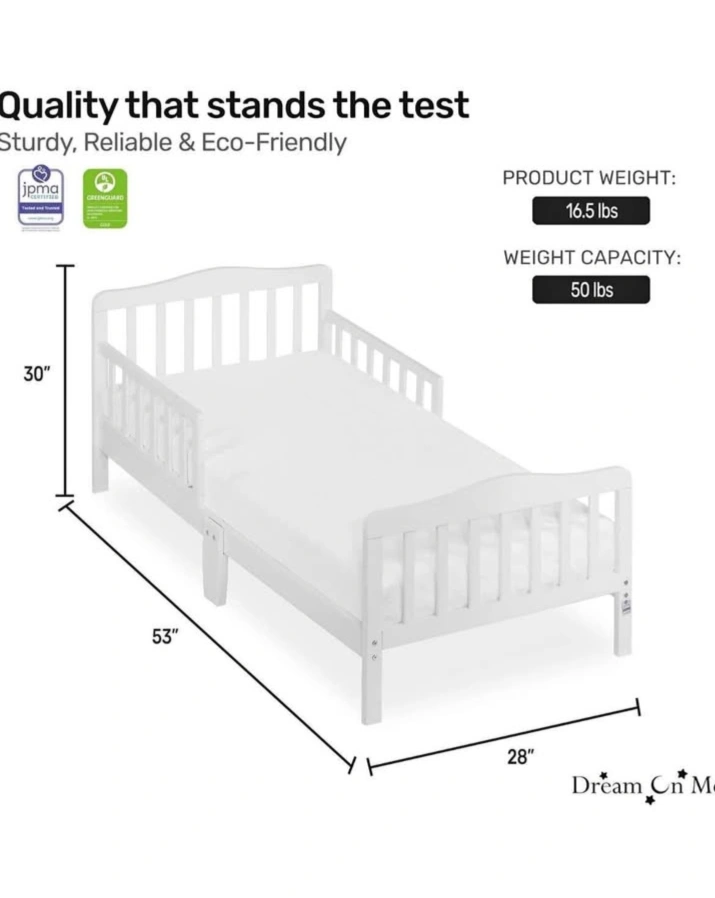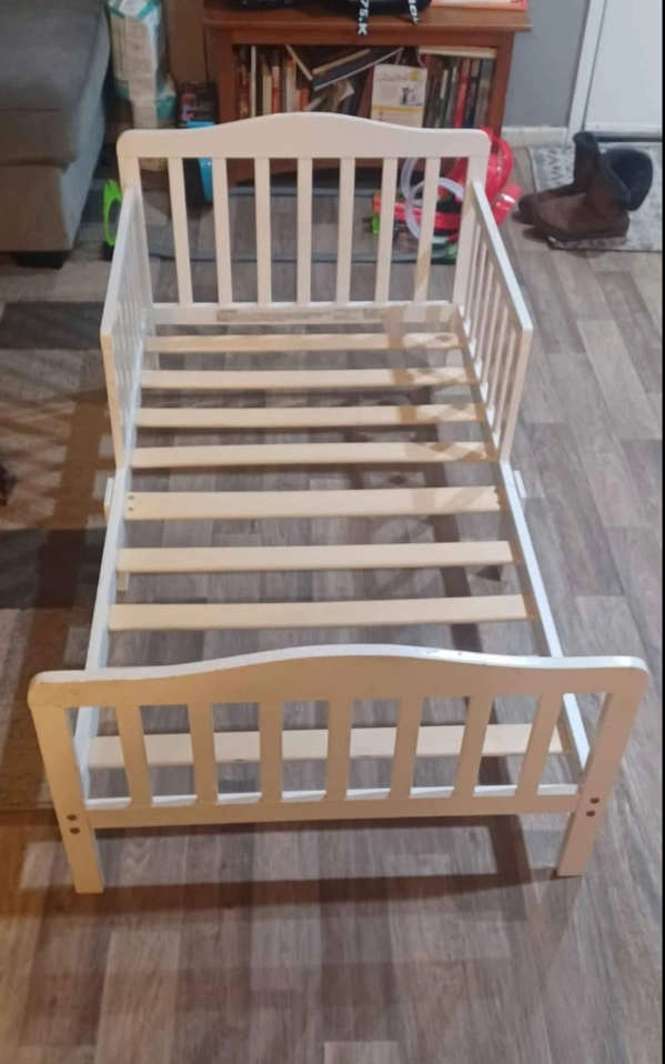 White toddler bed frame with guard rails. Includes slats. fair condition. could use some white touch up paint