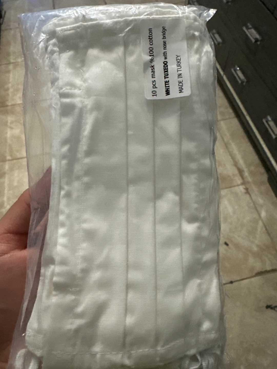 I'm selling a pack of 10 White Tuxedo face masks. They are brand new and still sealed in the original packaging. These masks are made of 100% cotton and feature a nose bridge for a comfortable fit. They are made in Turkey.