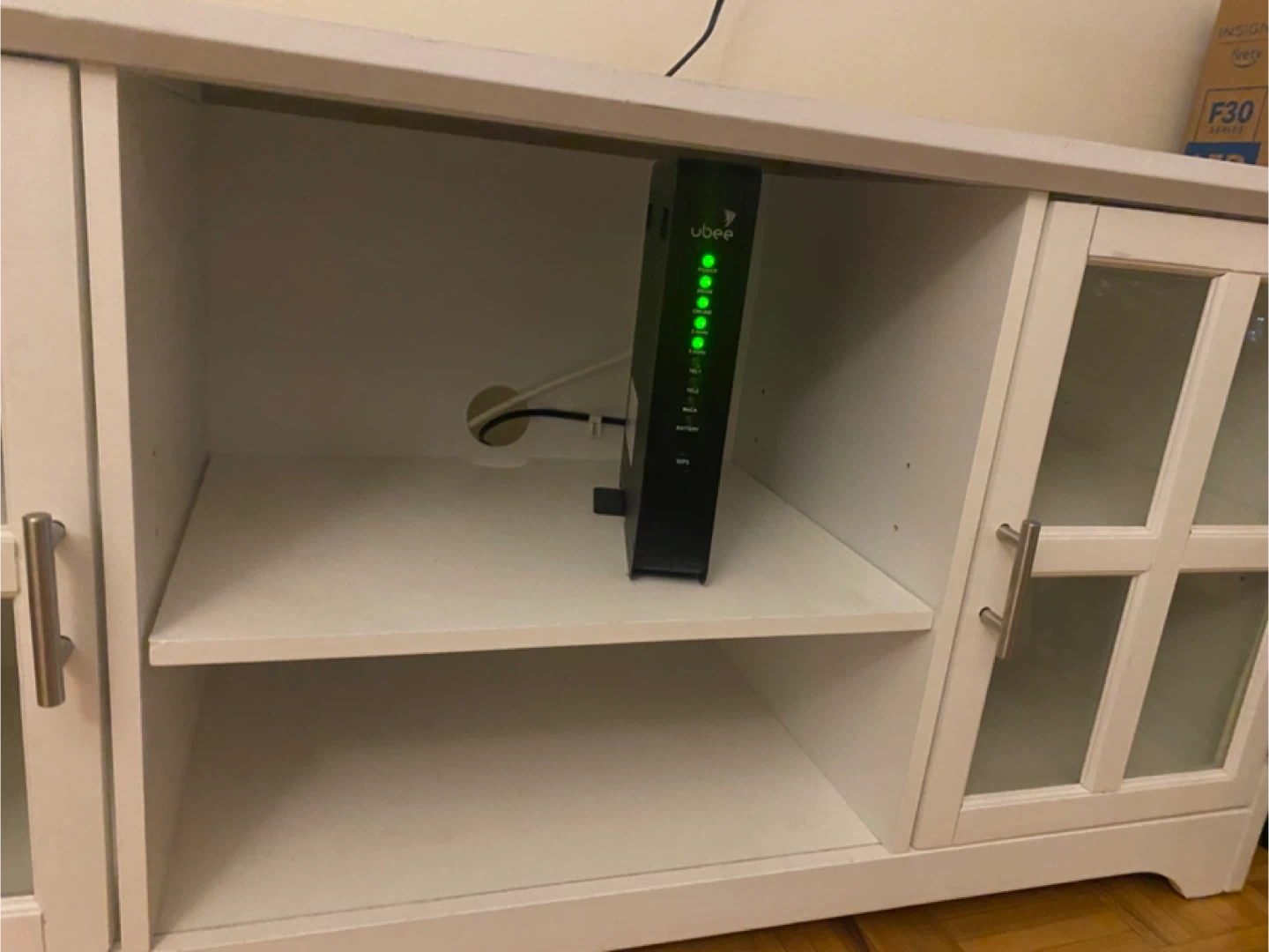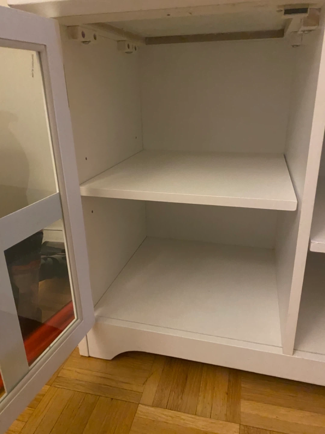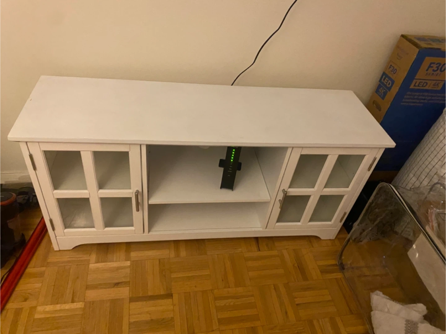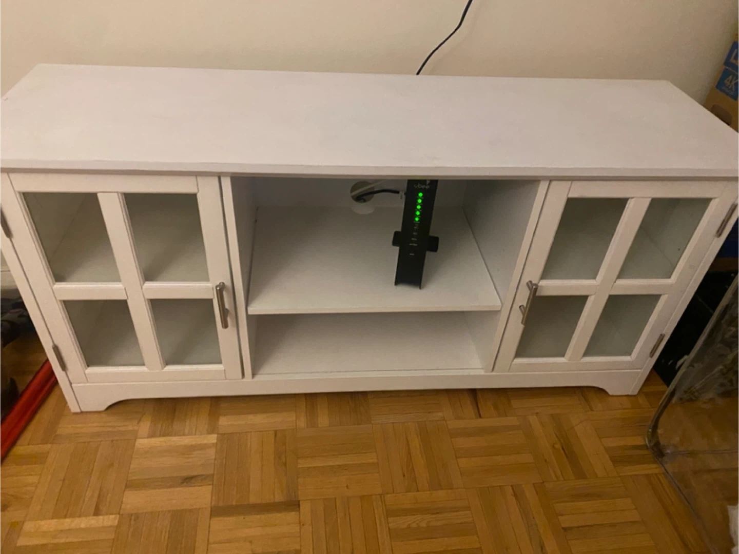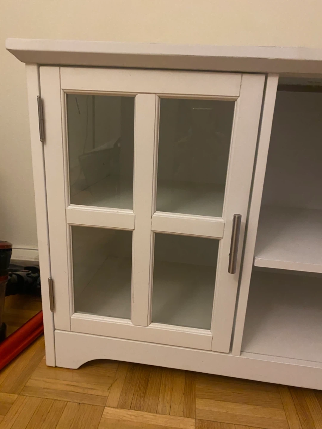 10Selling a nice white TV stand! It features glass doors and shelves for storage. It's in good condition and ready for a new home. It’s approx 62W, 16D, 24 inches tall. Must pick up. Doorman elevator building
