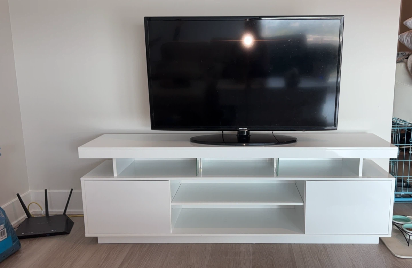 Selling a sleek white TV stand that offers plenty of storage space. It's in great condition and would look great in any living room. It features open shelves and closed cabinets to keep your media and accessories organized. Perfect for a modern and minimalist look! From a smoke free apartment. Need gone by 10/11