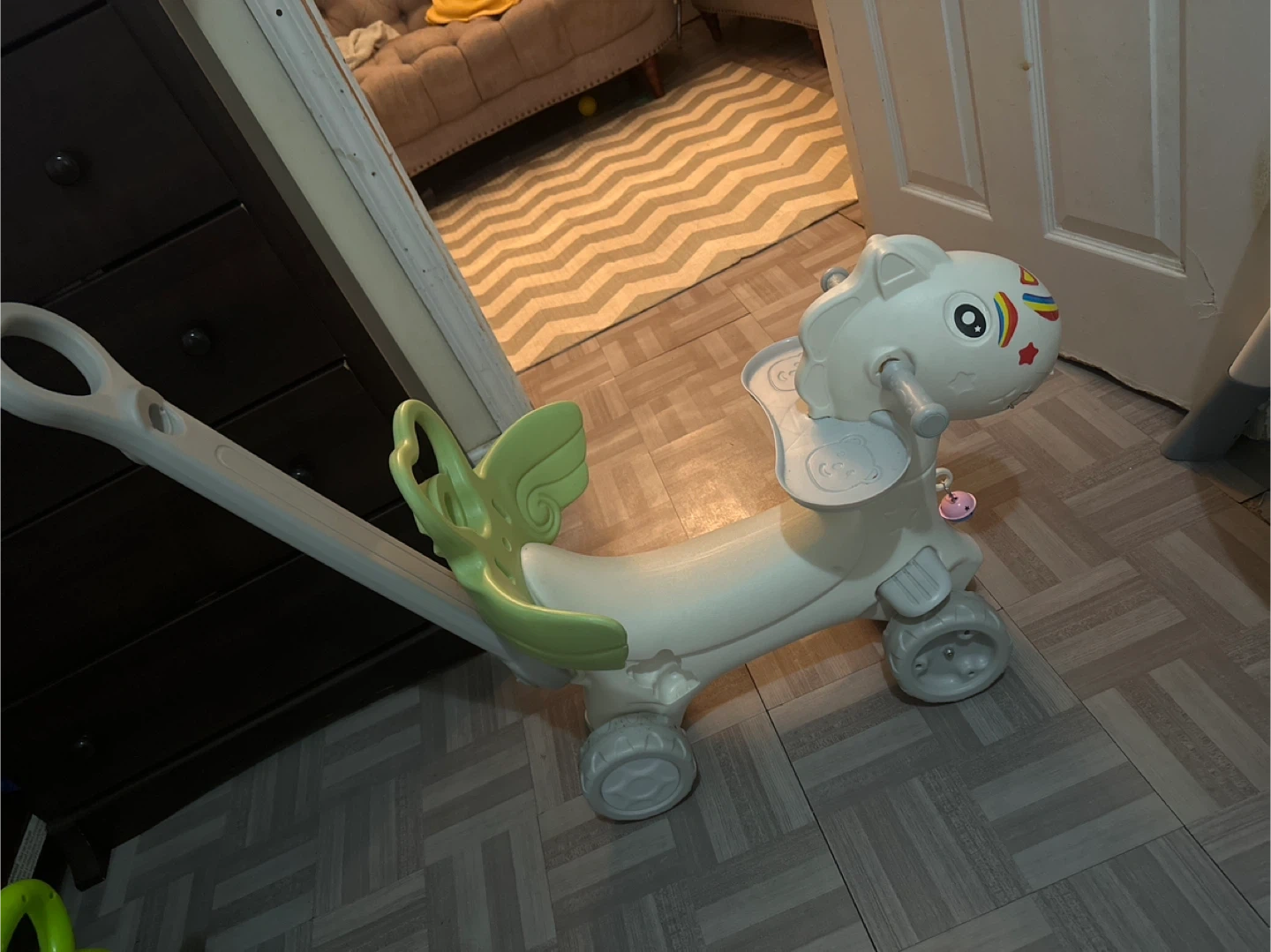 This cute white unicorn ride-on toy is perfect for toddlers! It features a push handle and a comfortable seat. The unicorn design is adorable, with colorful details on the head and wings it also has a tray to put some snacks
