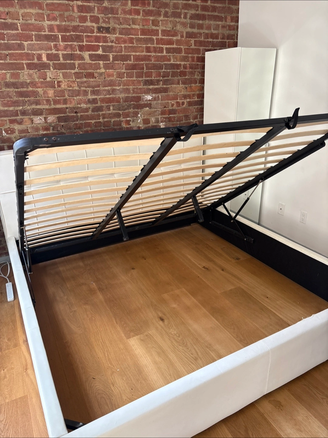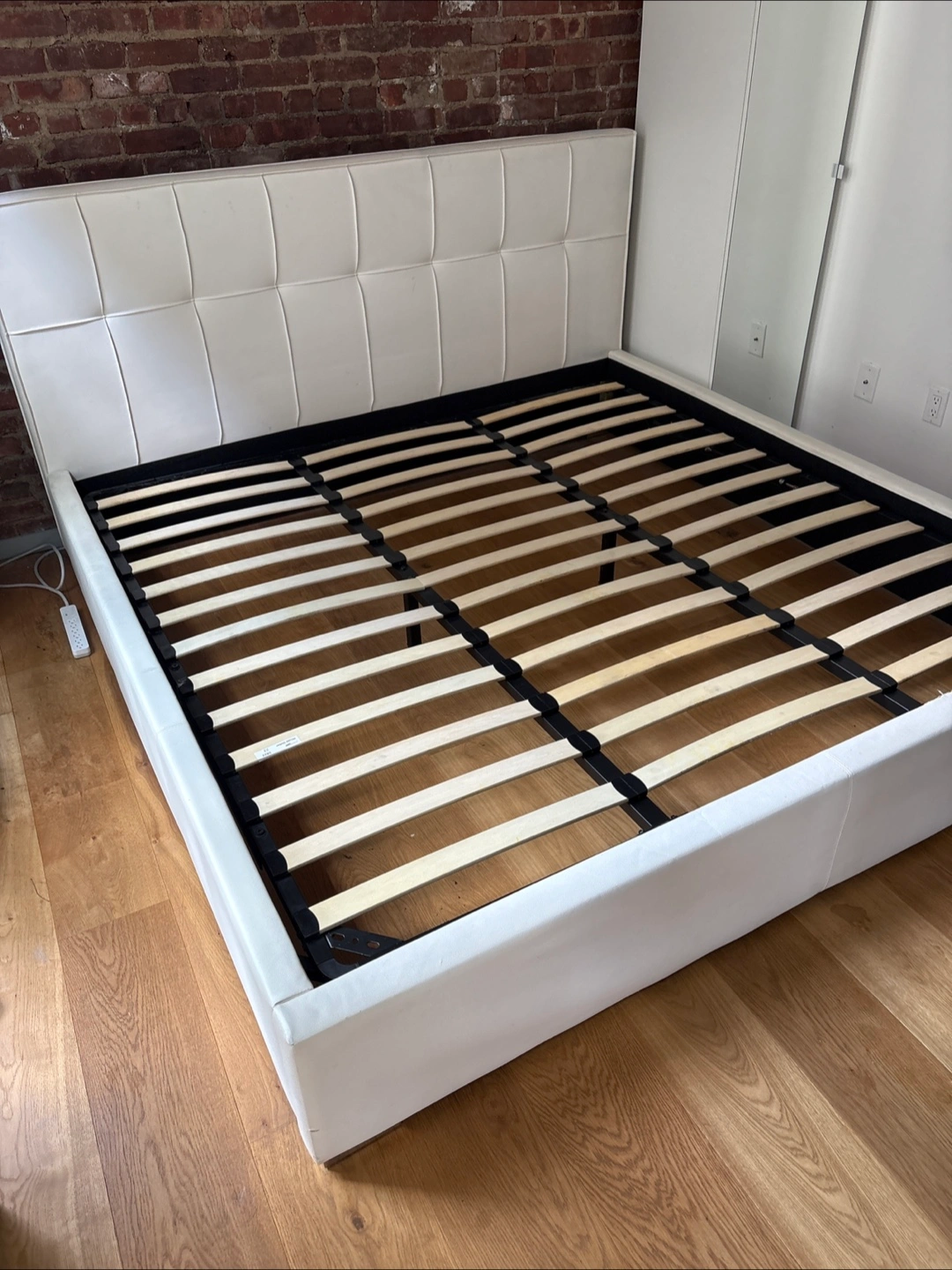 King bed frame with a white upholstered headboard. Contains wooden slats. Storage underneath as well. Has some normal wear and tear but works fine! Totally free. You’ll have to disassemble because I have no idea how to do that.