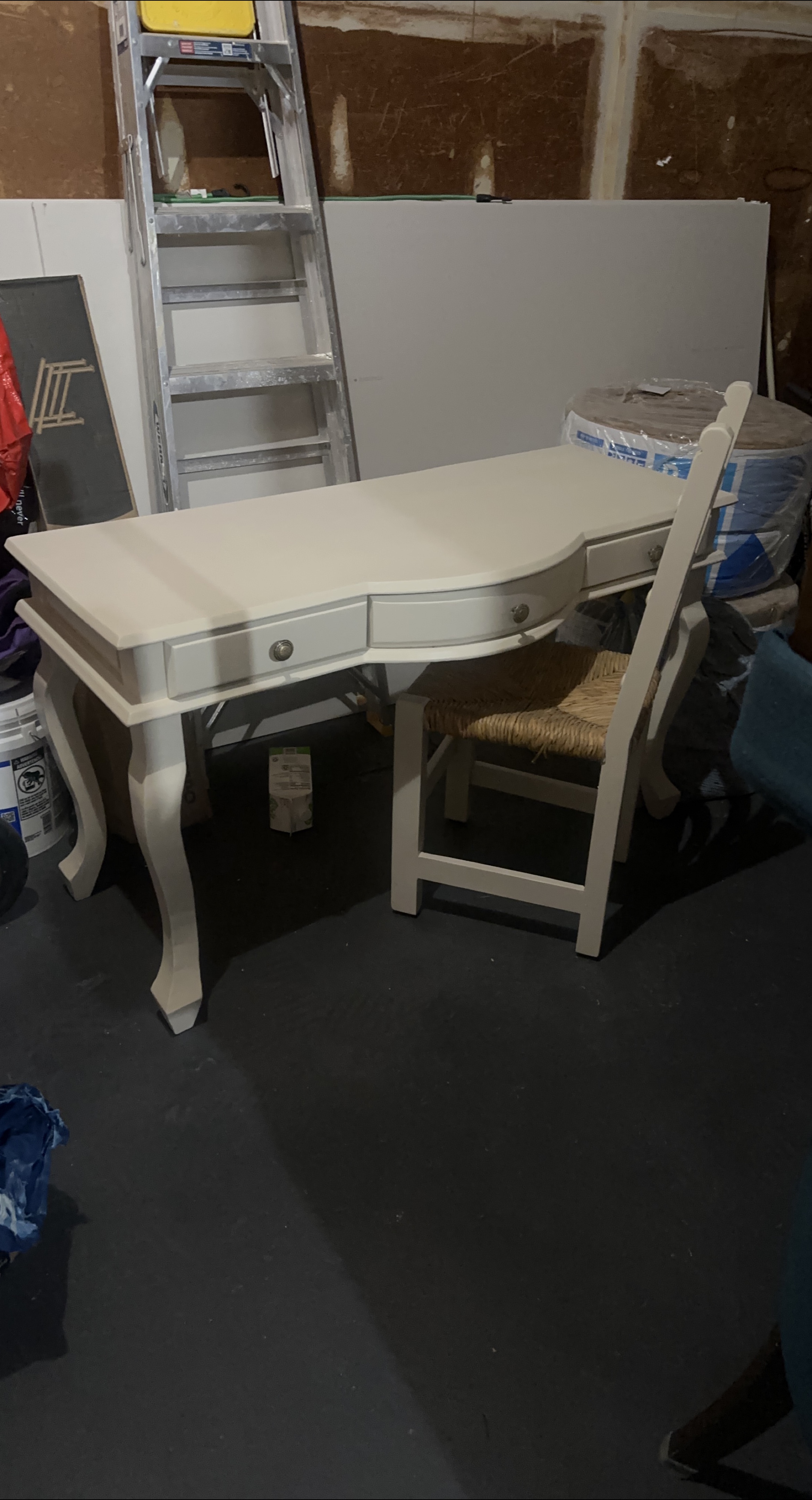 10Selling a cute white vanity desk with a matching chair! It features a curved design and drawers for storage. Perfect for a bedroom or dressing area. Delivery available with xtra fee depending distance