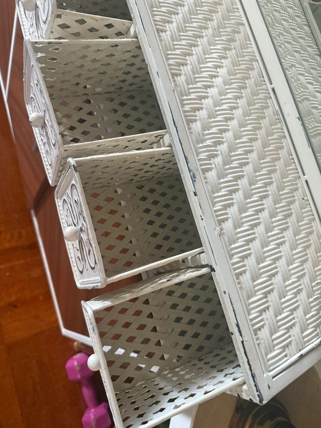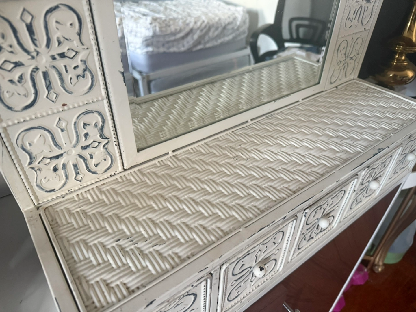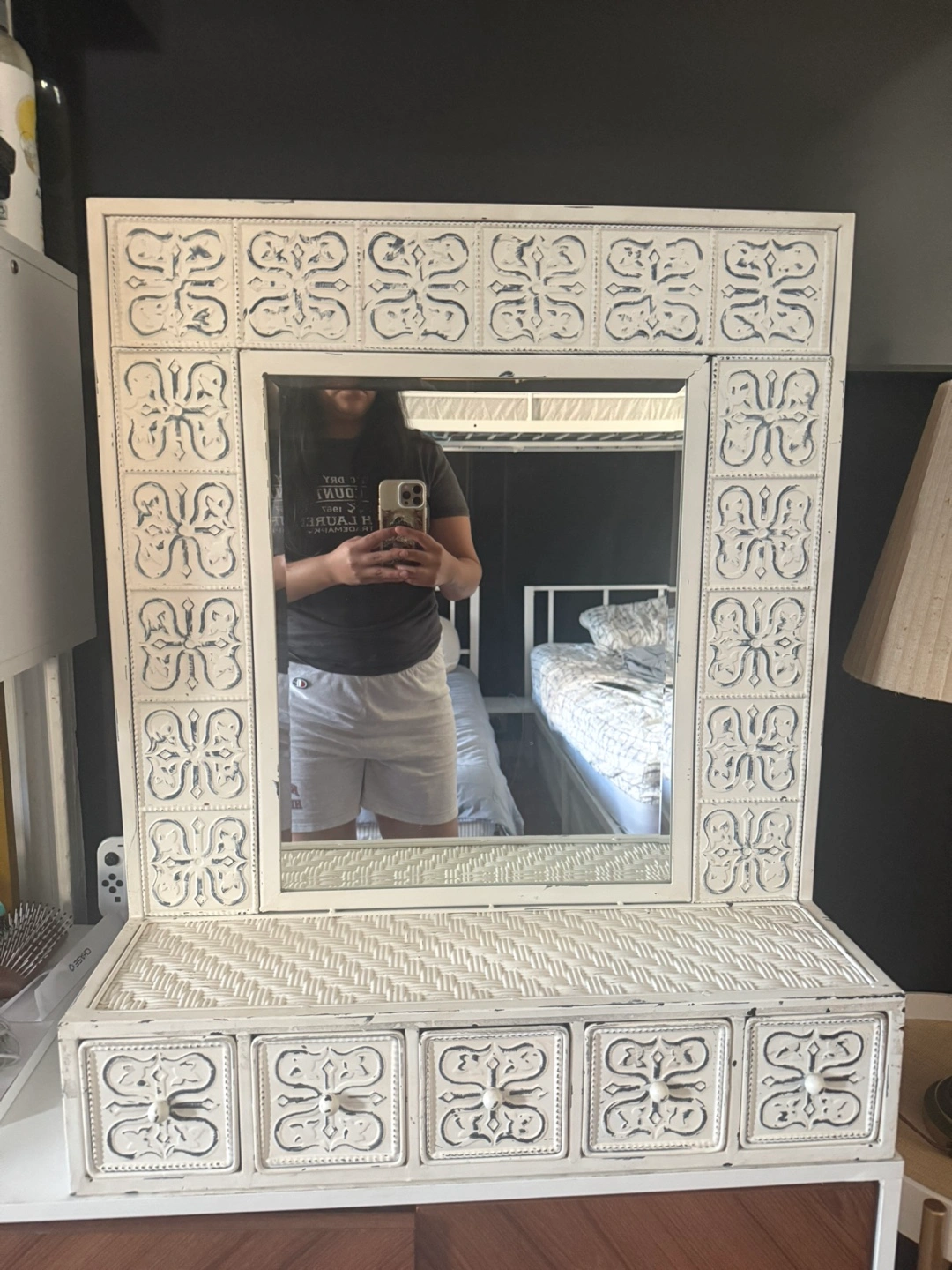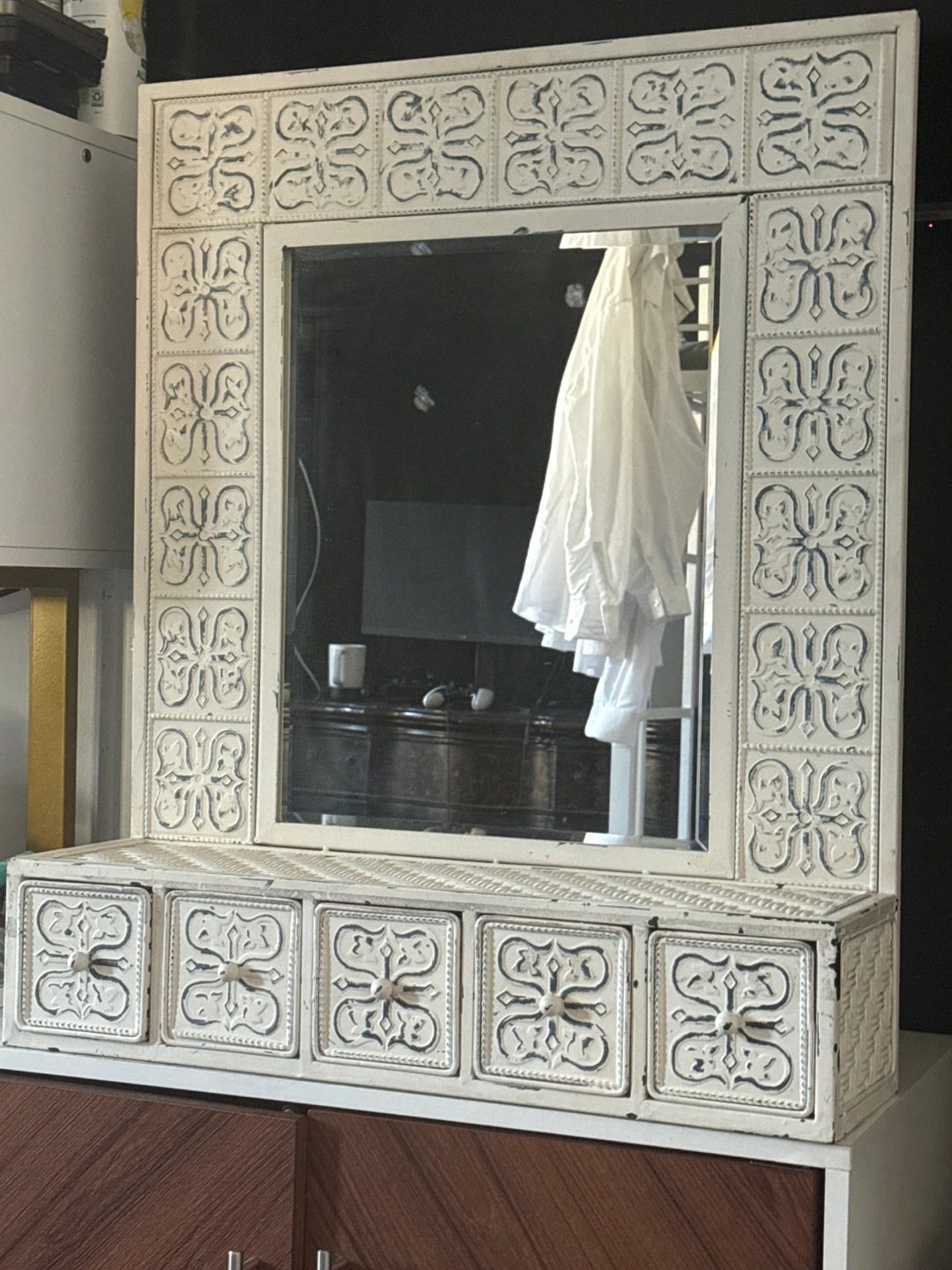 Selling a charming vanity mirror. It features a decorative white frame with a unique tiled pattern. Perfect for adding a touch of character to any room! Has 5 drawers to put makeup or other things inside . It’s Metal, very sturdy.It can also be hung on the wall. Selling for a friend.
