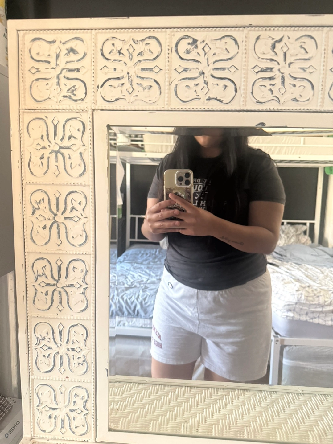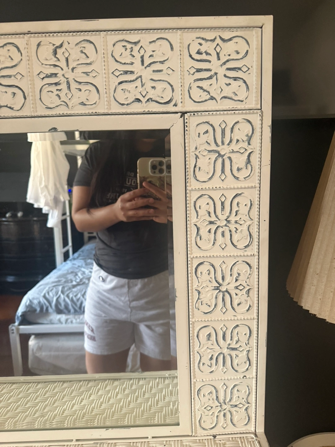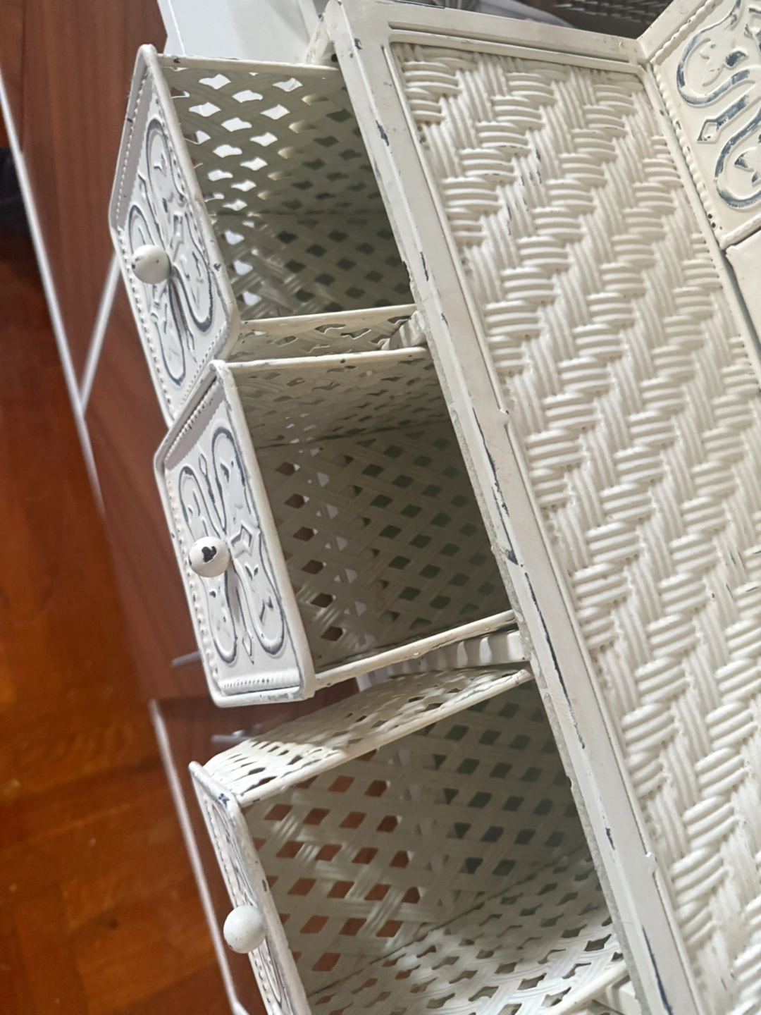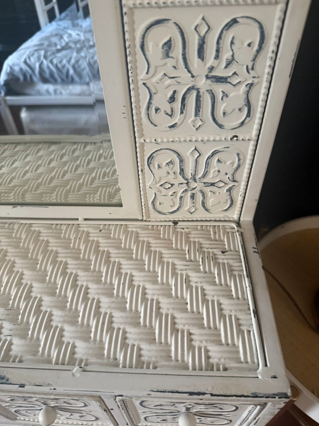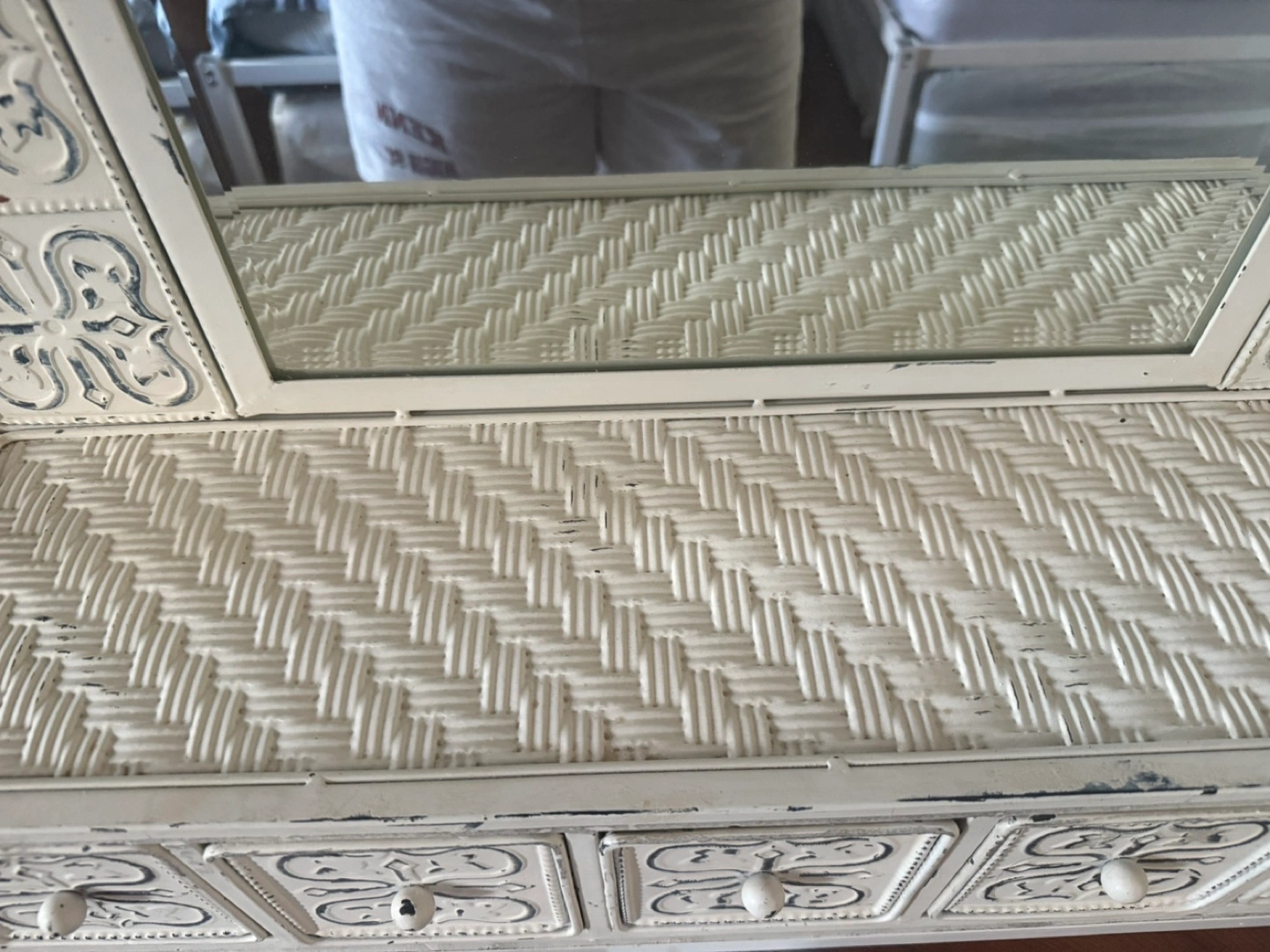 Selling a charming vanity mirror. It features a decorative white frame with a unique tiled pattern. Perfect for adding a touch of character to any room! Has 5 drawers to put makeup or other things inside . It’s Metal, very sturdy.It can also be hung on the wall. Selling for a friend.