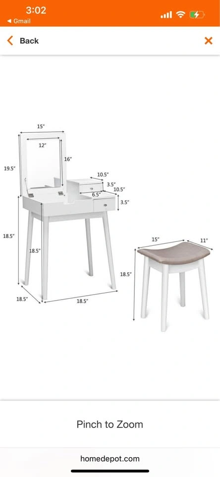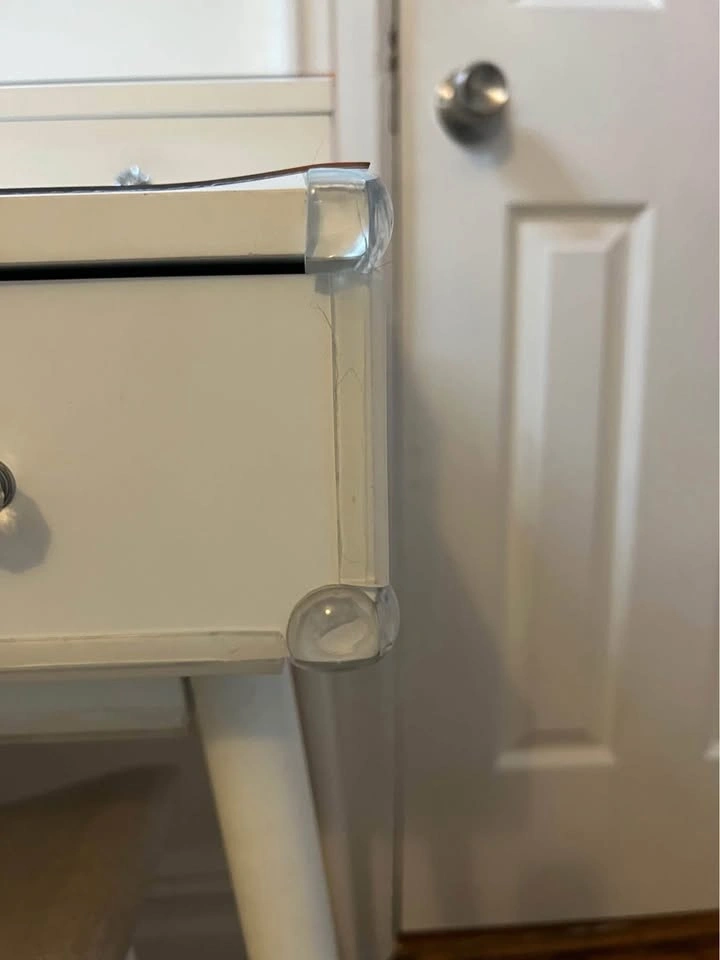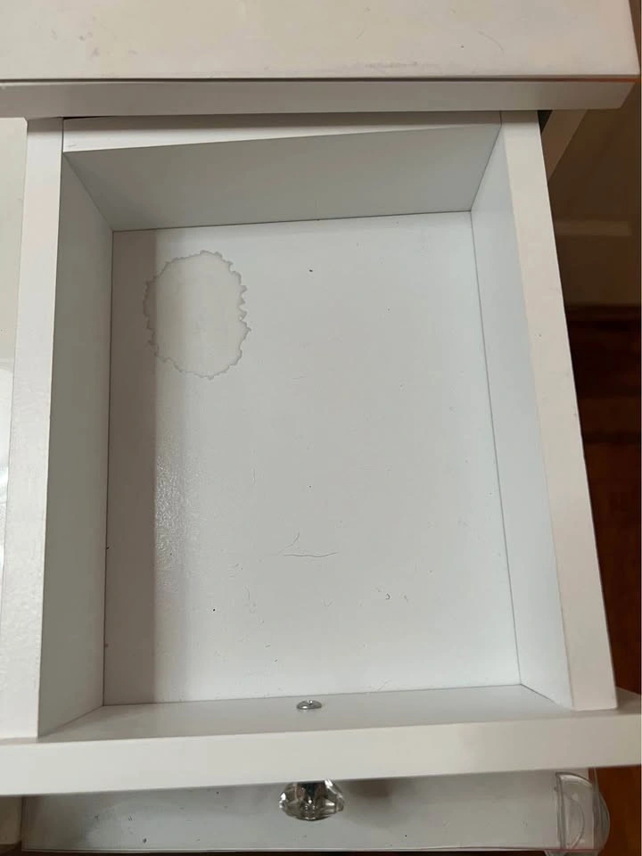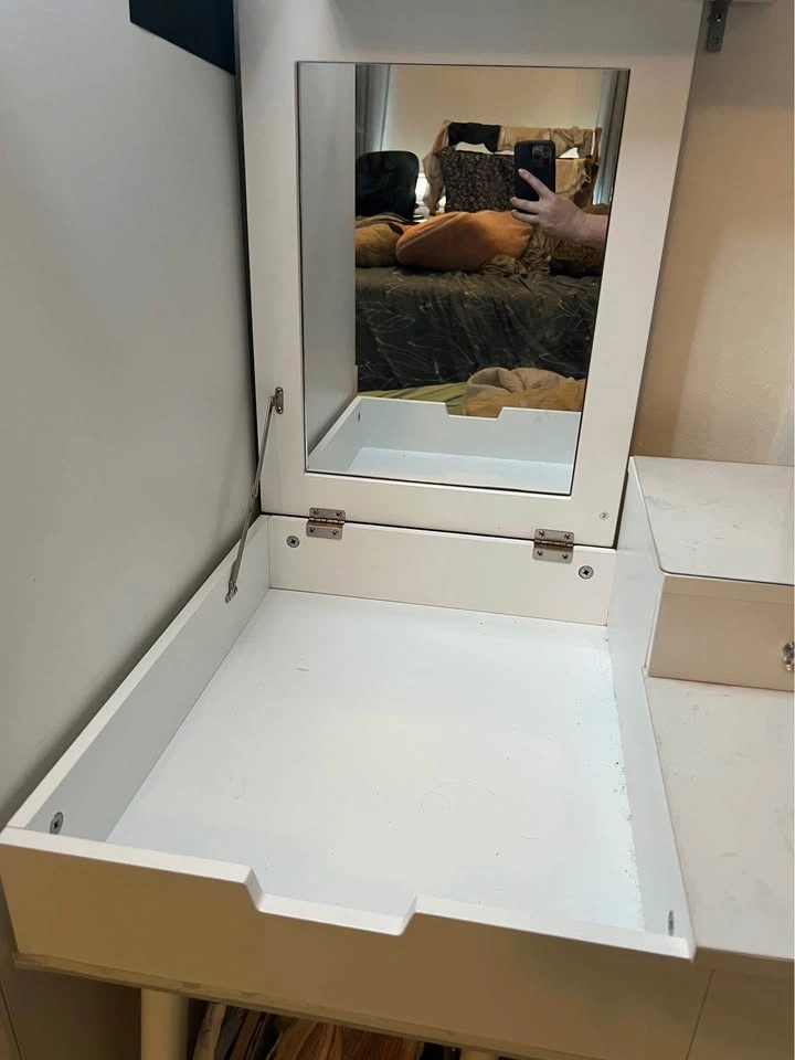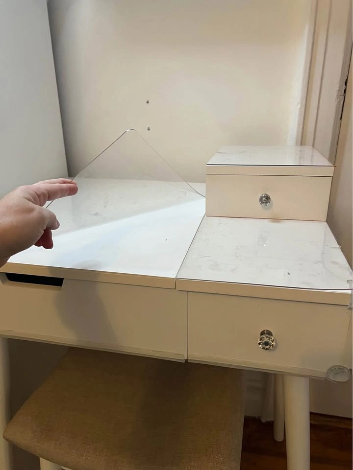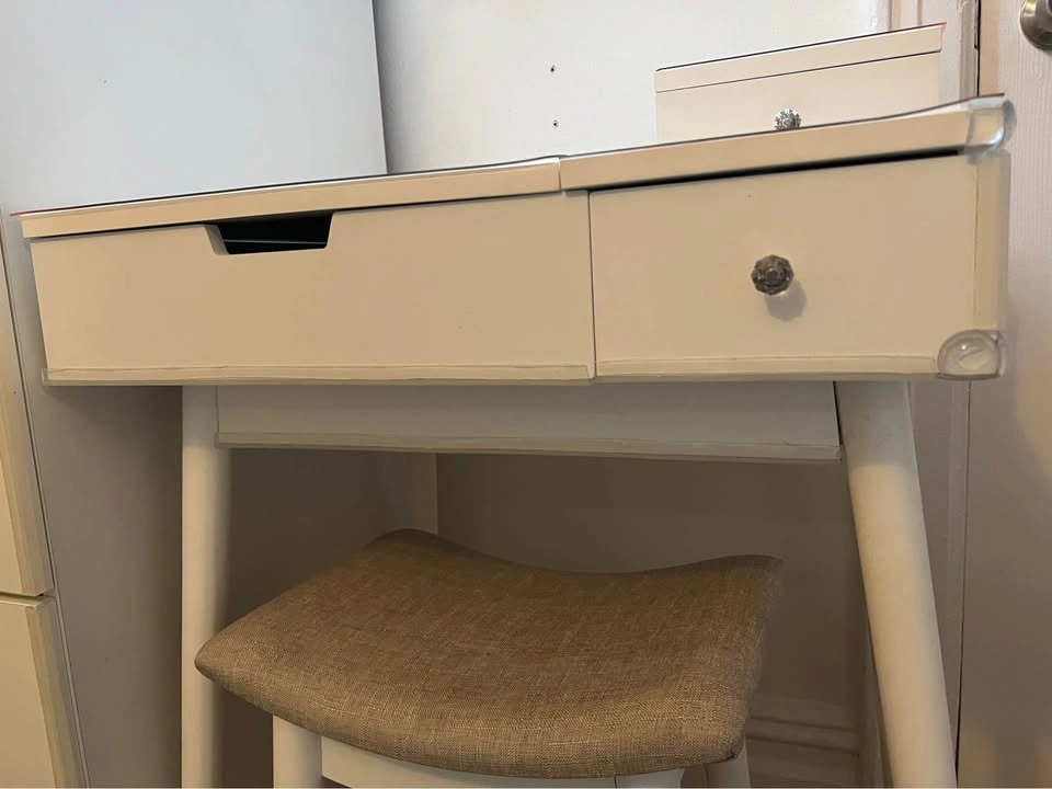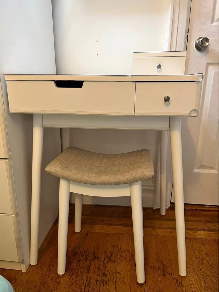 65Small white vanity desk with built-in mirror & sitting stool, in great condition. Made of wood/mdf. The only flaw is a small water stain inside one of the drawers as shown in the last picture. We put some silicone bumpers on the edges to protect our toddler’s head but these are removable. The feet of the table & stool have felt on the bottom to protect the wood floors, which are also removable. I also have plastic covers on top to protect the wood from wetness that you can easily keep or remove (they are not stuck on). Pick up fully assembled in Washington Heights.