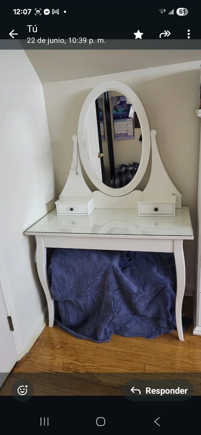 60Selling a charming white vanity table! It features a lovely oval mirror, two small drawers for storage, and a glass top. Perfect for adding a touch of elegance to your bedroom or dressing area