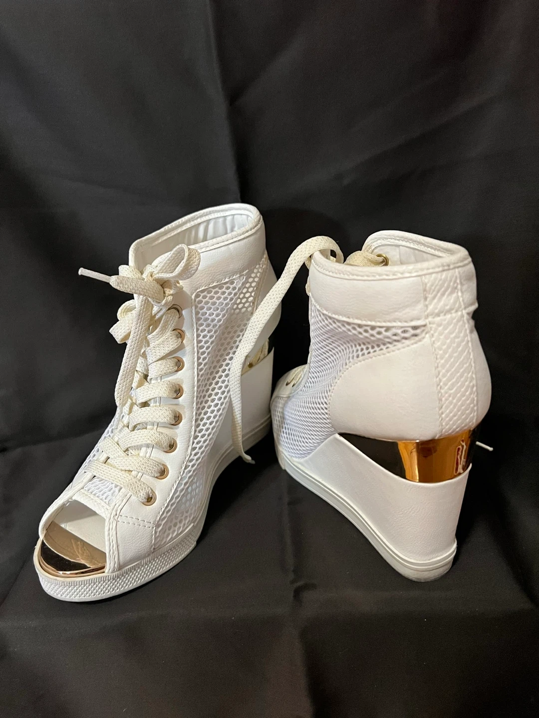 10These are stylish white wedge heel sneakers. They feature a unique design with a peep-toe and lace-up closure. The gold accent on the heel adds a touch of elegance to these eye-catching shoes