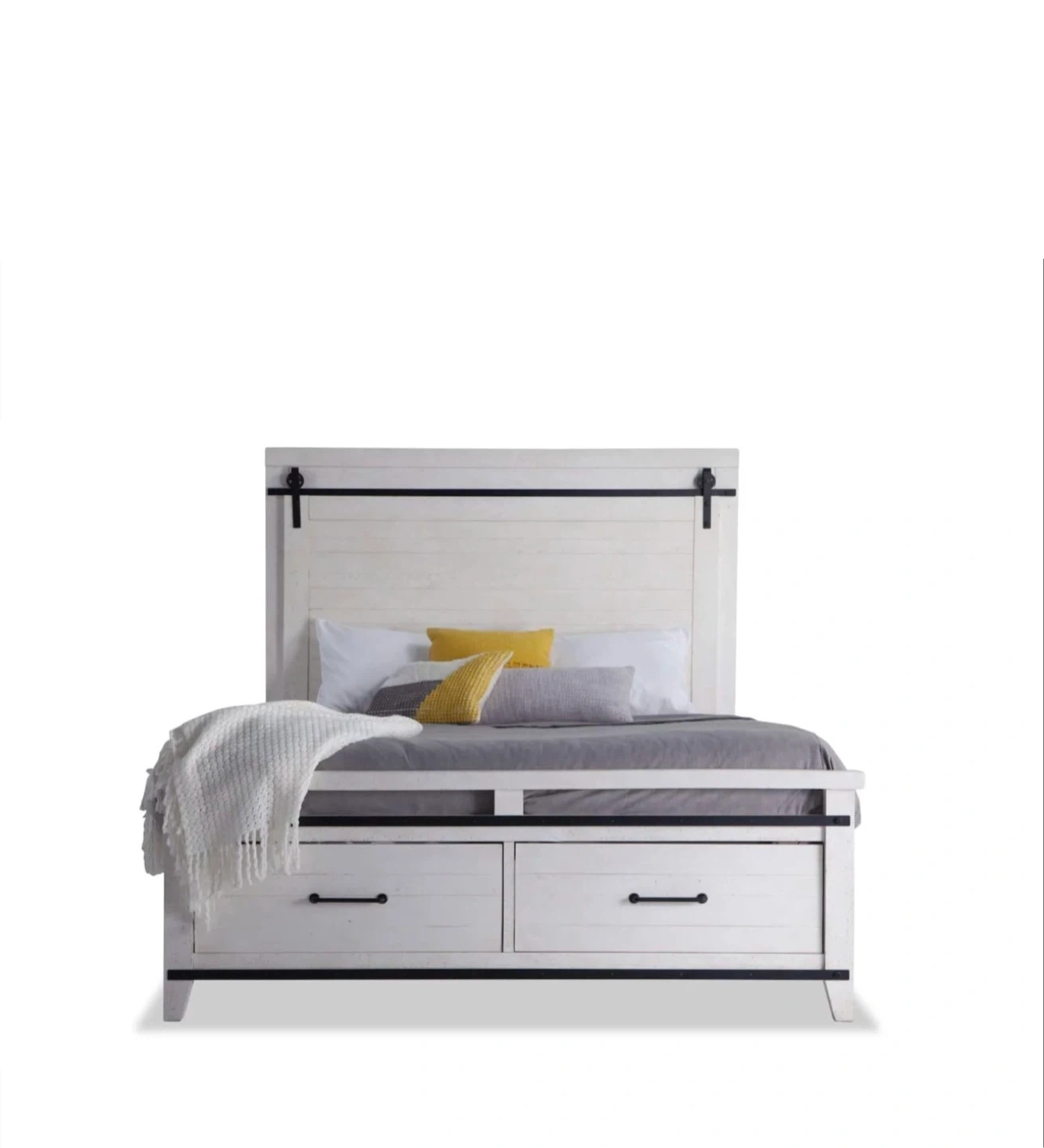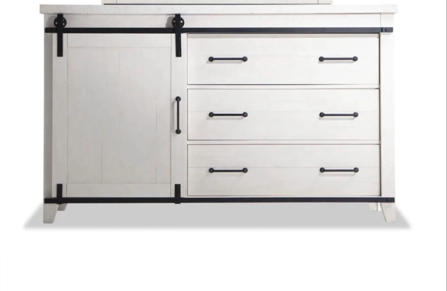 60Selling a beautiful white wood bedroom set! This set includes a dresser, bed frame, and nightstand, all with a rustic, farmhouse-inspired design. The pieces feature black hardware accents, adding a touch of contrast to the bright white finish. Perfect for creating a cozy and stylish bedroom retreat