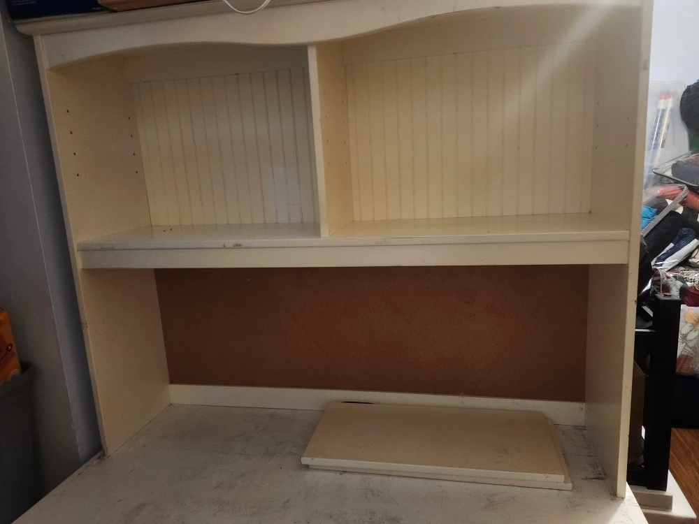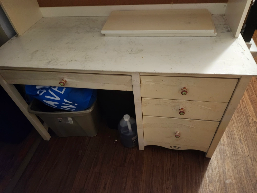 NEED GONE!! White wooden desk with a hutch. It has some wear and tear, as you can see in the photos, but it's still a functional piece of furniture. It features a hutch with shelves and a desk with drawers for storage. Perfect for a home office or study space! NEED GONE ASAP
