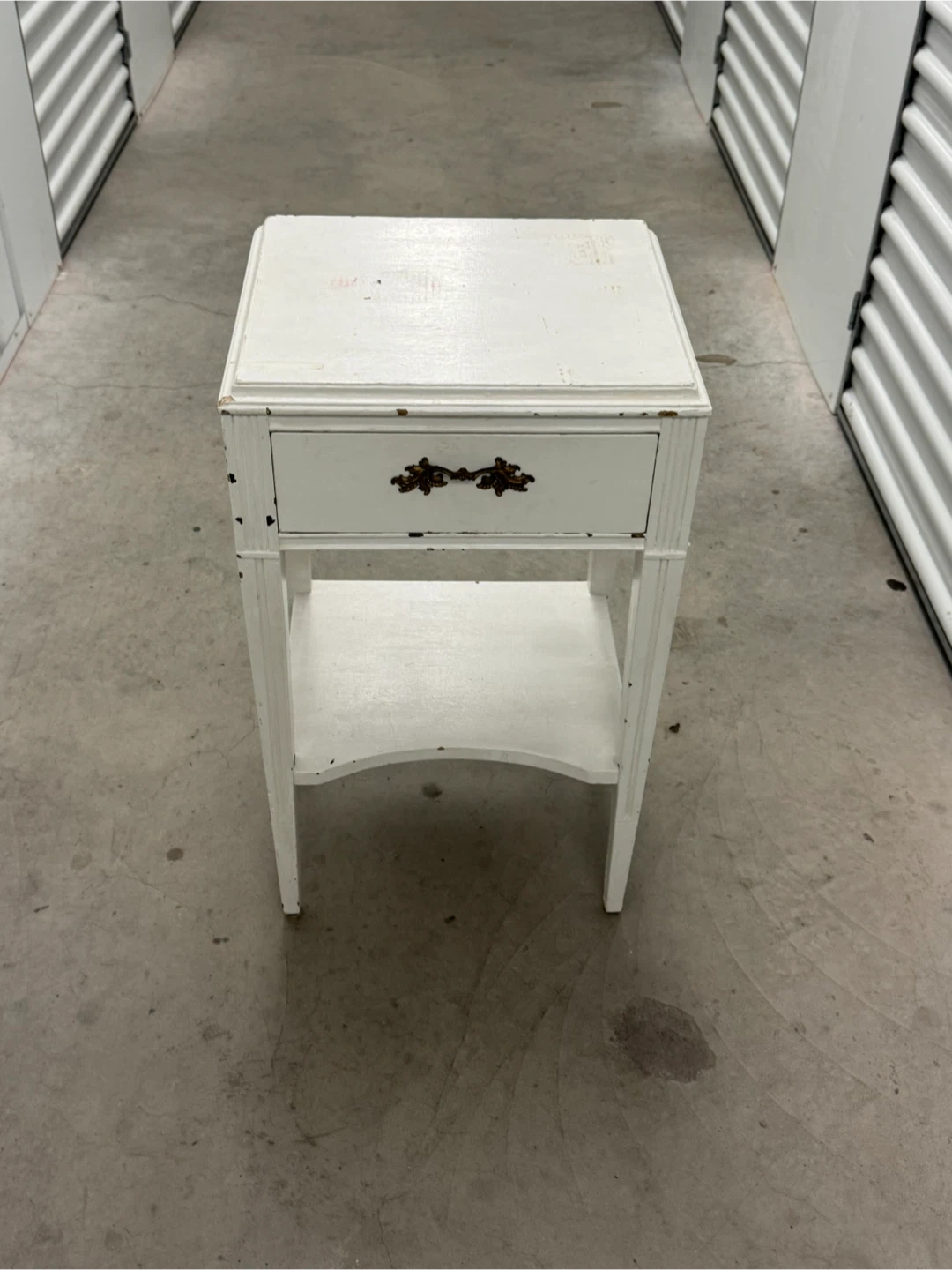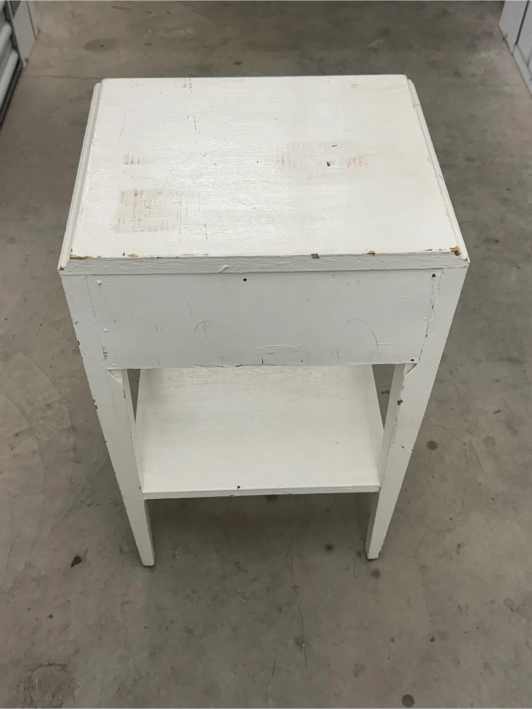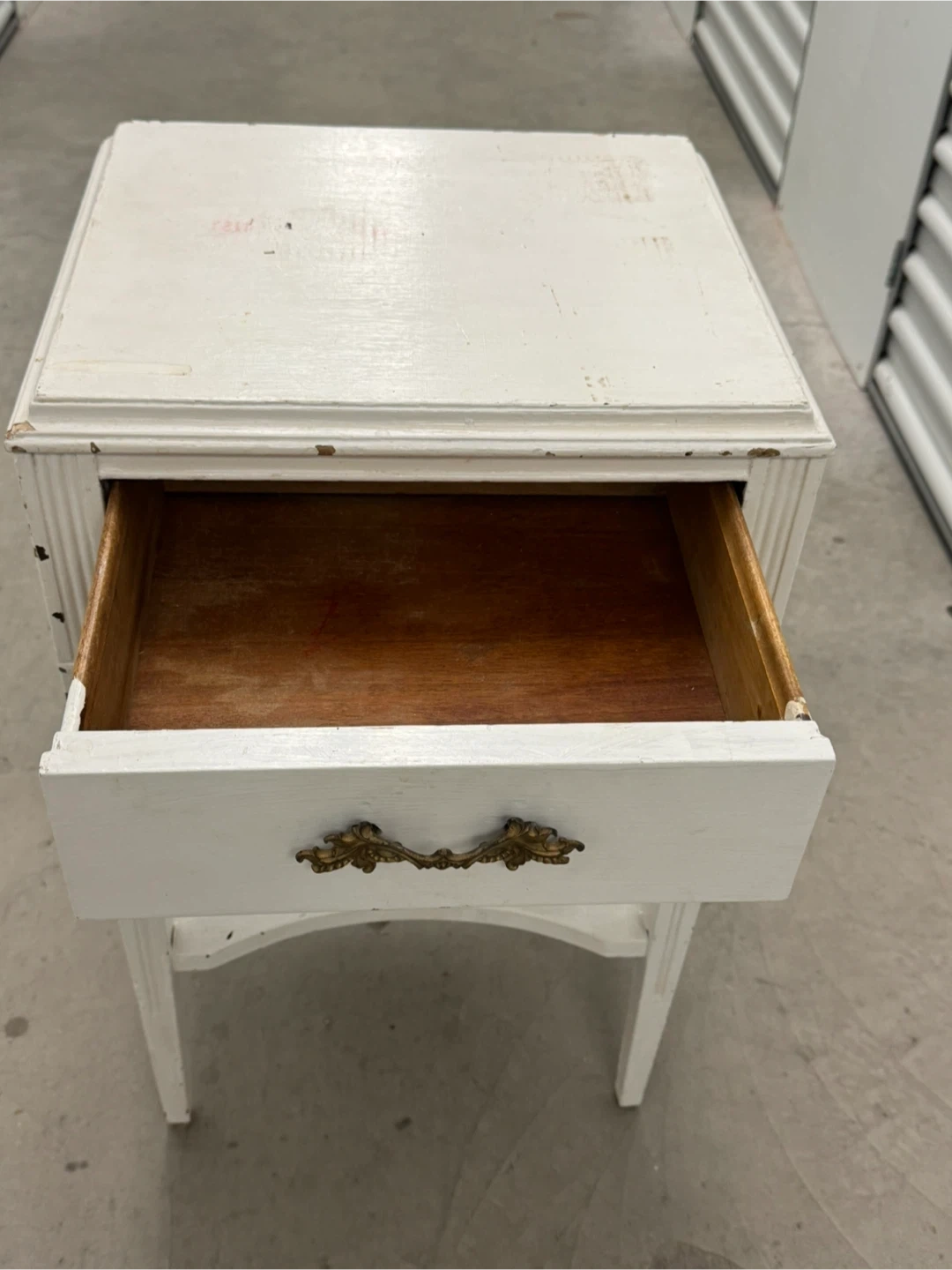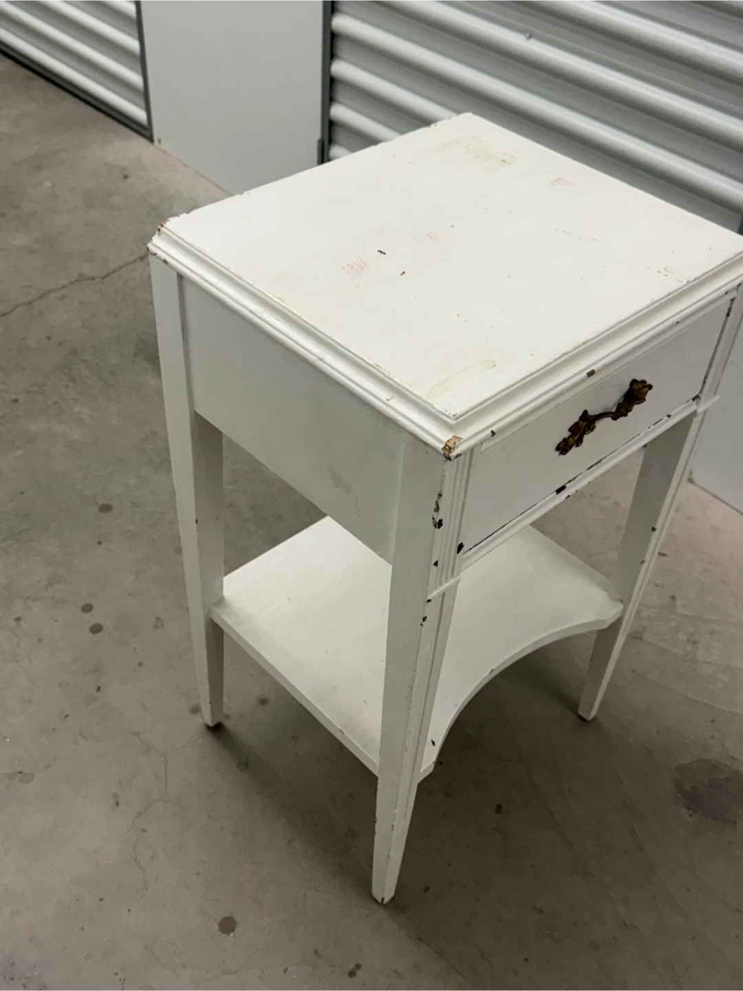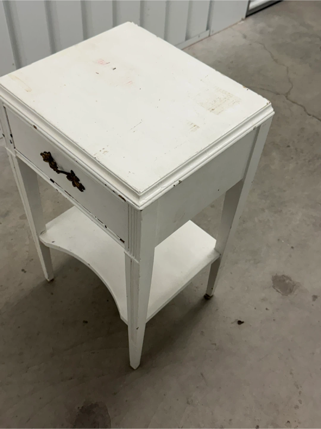 89Selling a white wooden nightstand! It has a drawer and a shelf, perfect for storing your bedside essentials. It's in fair condition with some signs of wear, as shown in the photos. Great for adding a touch of vintage charm to your bedroom 16.25” x 14” x 27.5” **Willing to Deliver**