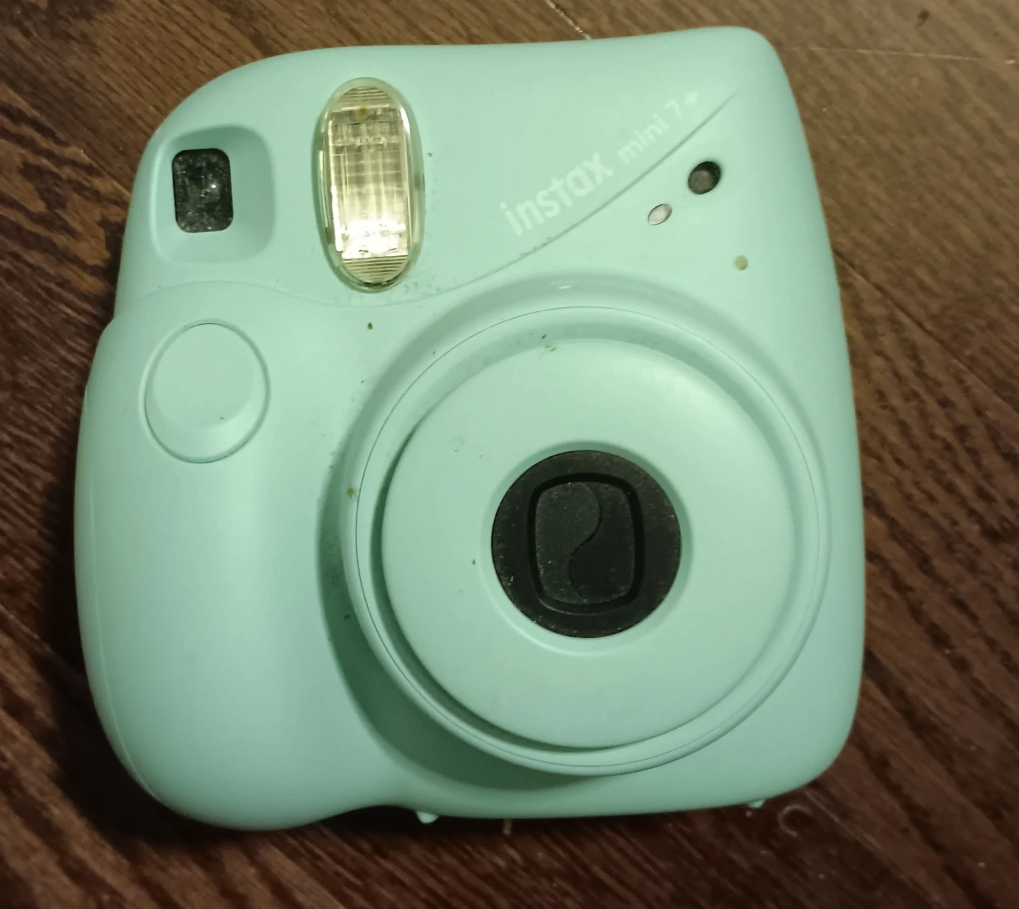 Fujifilm Instax Mini 7+ instant camera in a pale blue color. This camera takes instant photos and has a built-in flash.
