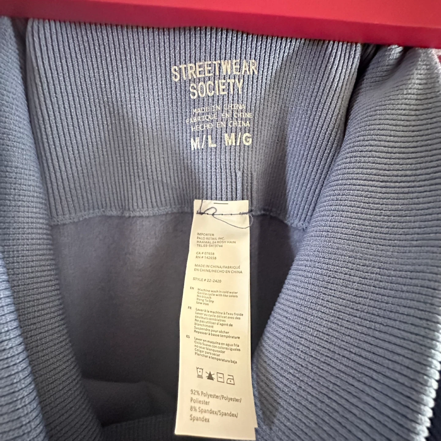 Streetwear Society ribbed leggings. These are a size M/L. They're made from a blend of 92% Polyester and 8% Spandex. These leggings are comfortable and versatile.