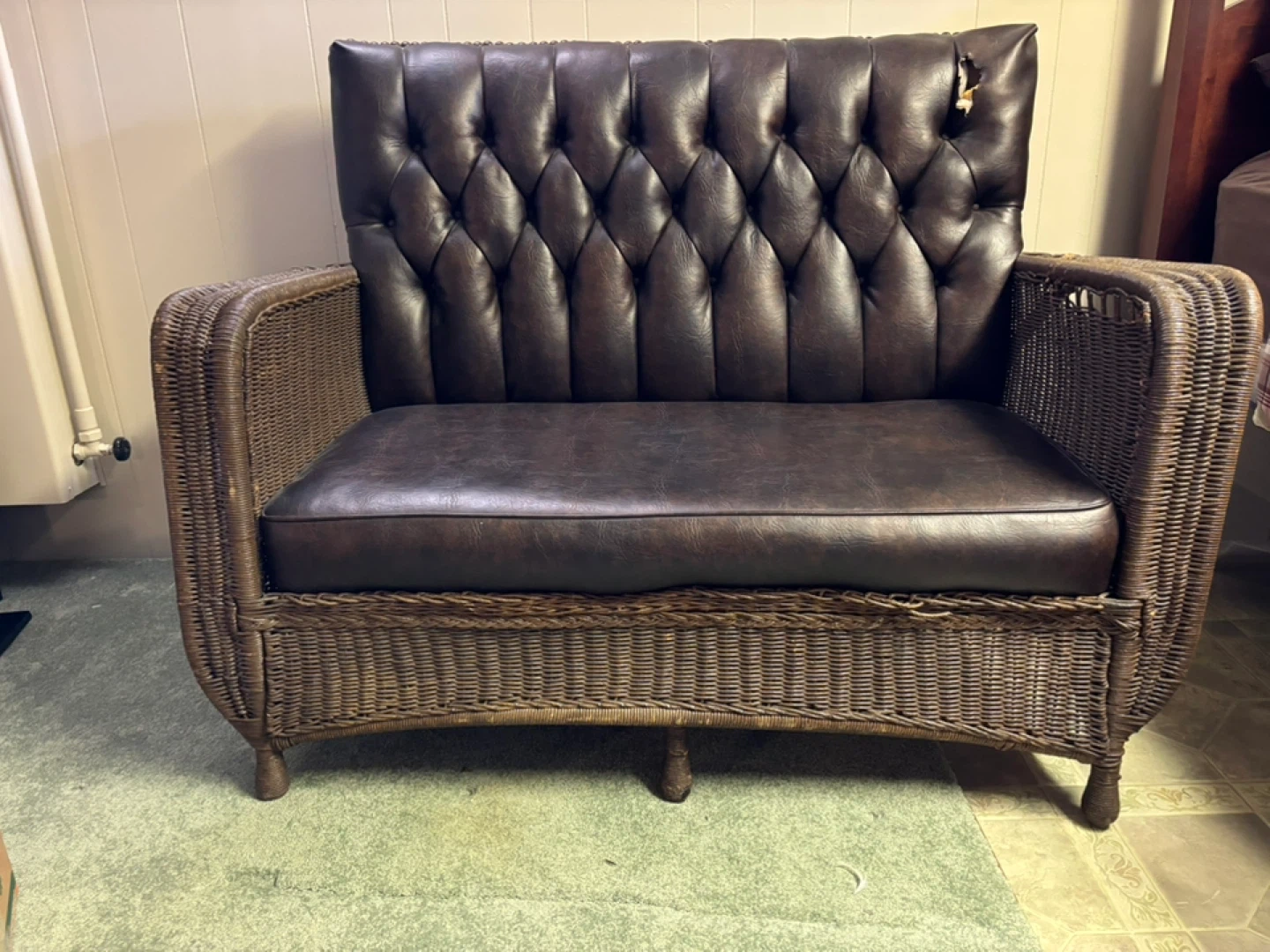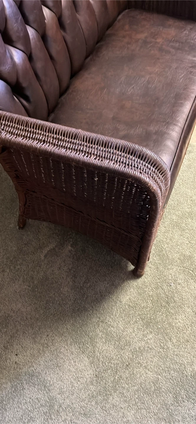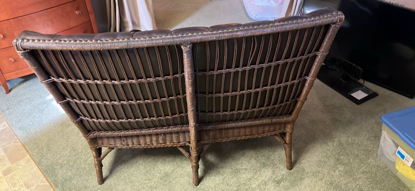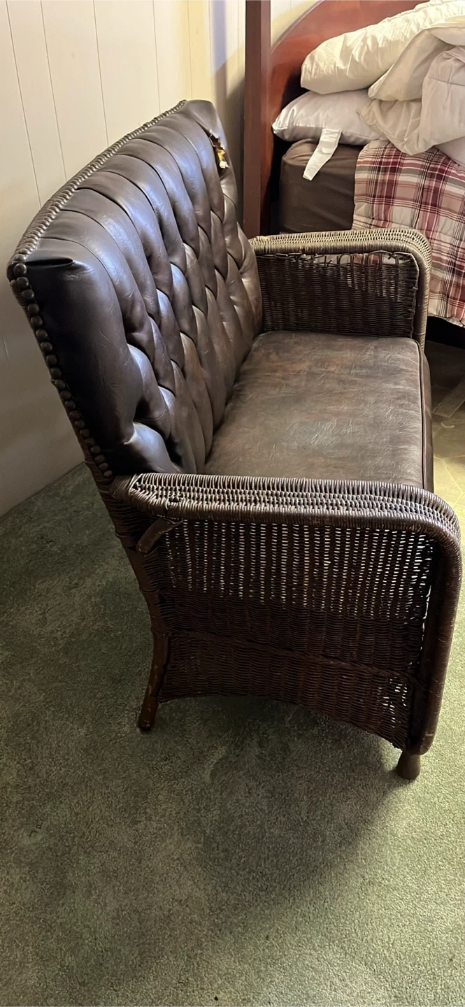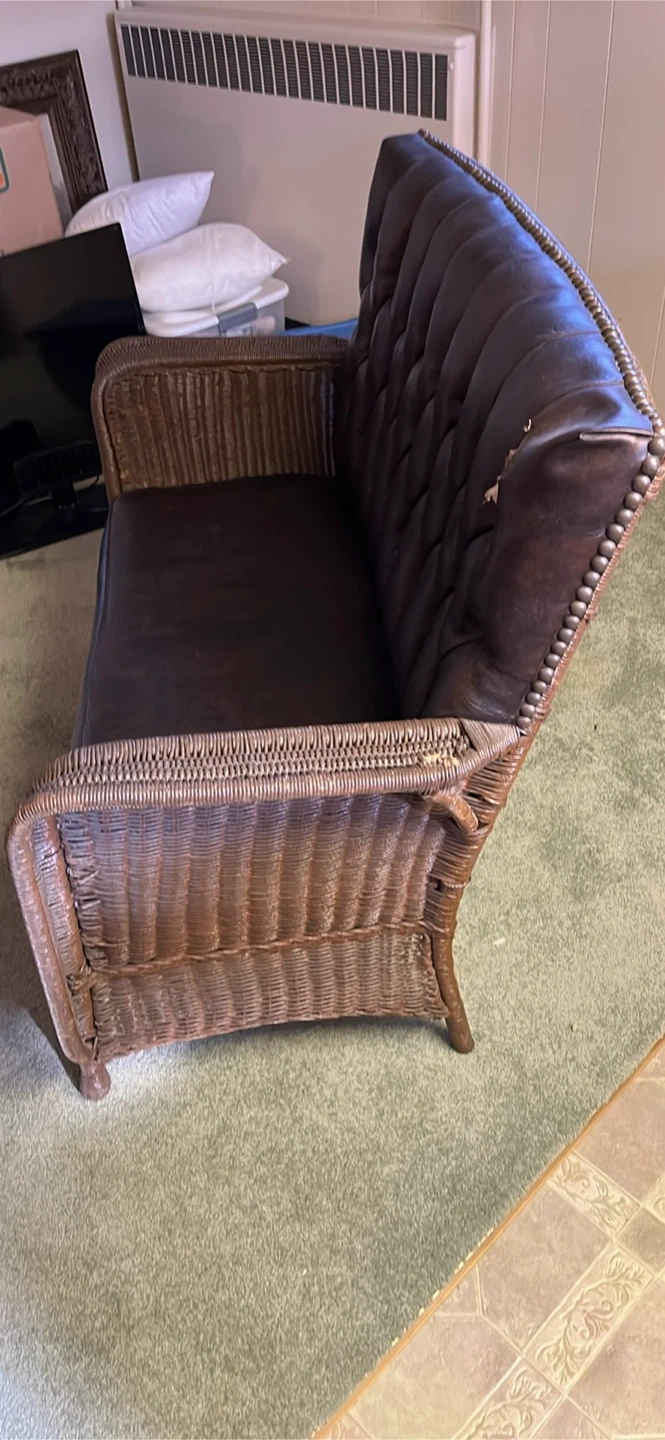 Selling a wicker loveseat featuring a brown leather cushion. It's a charming piece that could add a unique touch to any room. There is some wear and tear on the back cushion and right arm of the loveseat.