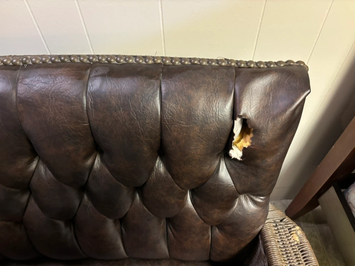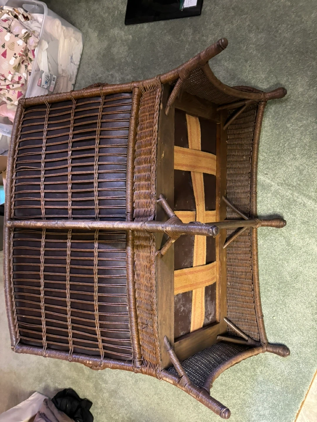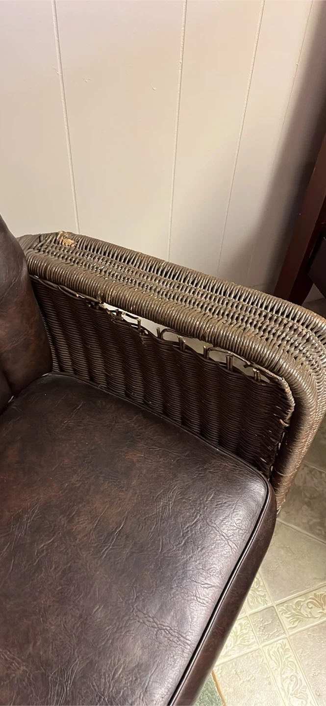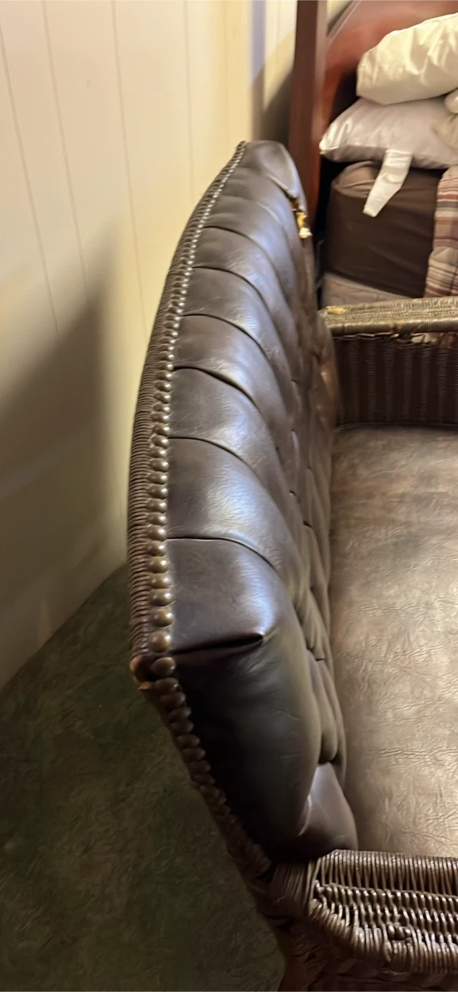 Selling a wicker loveseat featuring a brown leather cushion. It's a charming piece that could add a unique touch to any room. There is some wear and tear on the back cushion and right arm of the loveseat.