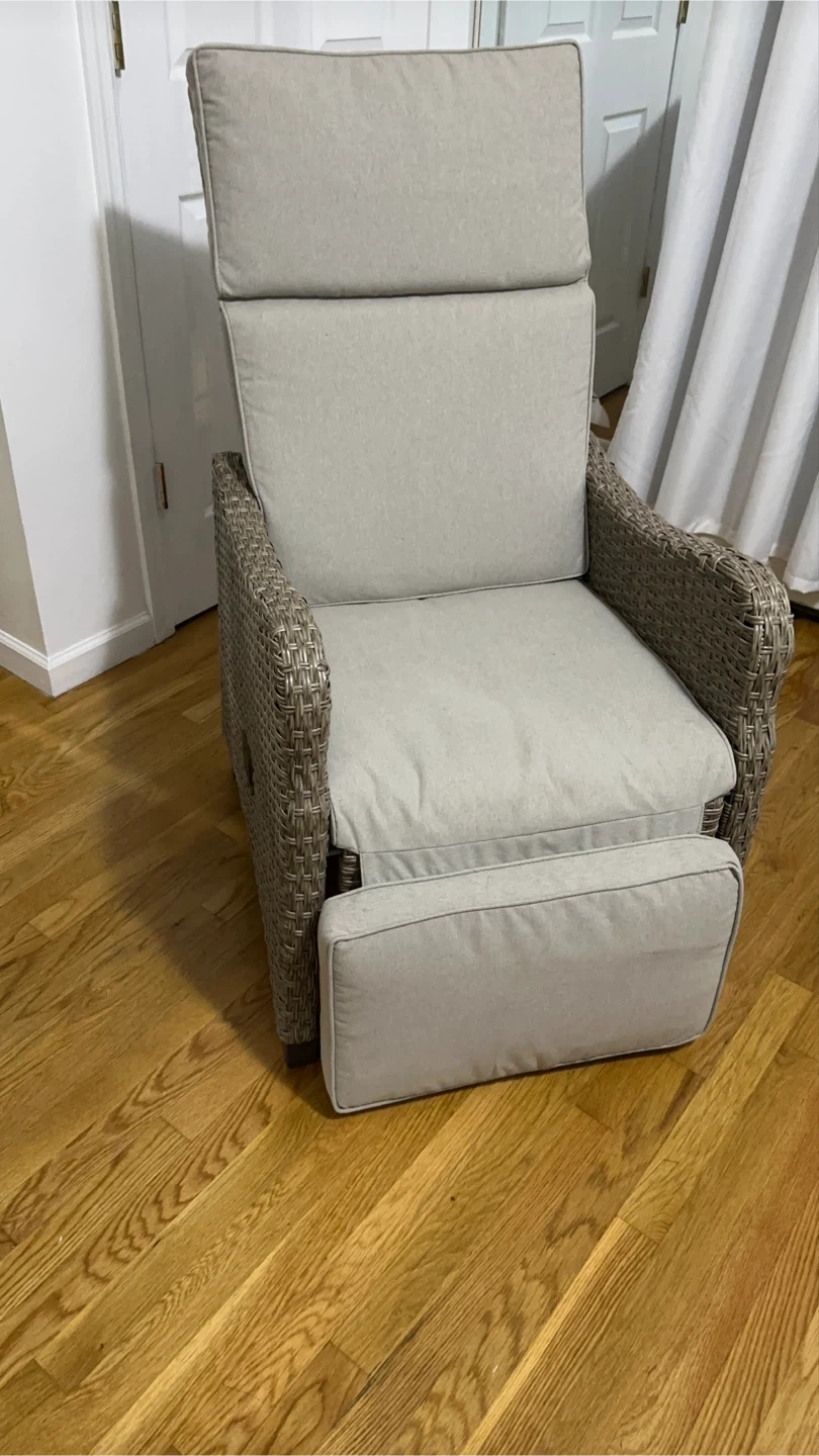 Selling a comfortable wicker outdoor recliner chair! It features a neutral color that would fit in well with any outdoor decor. Perfect for relaxing in your backyard or patio