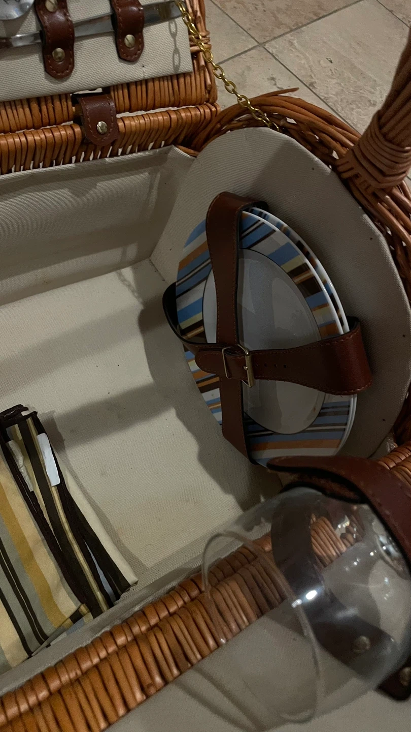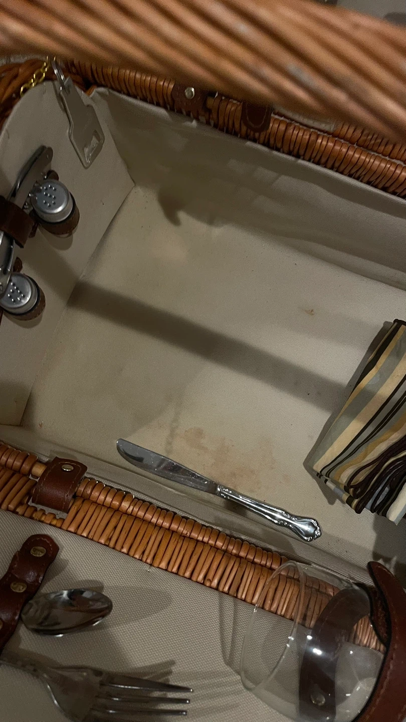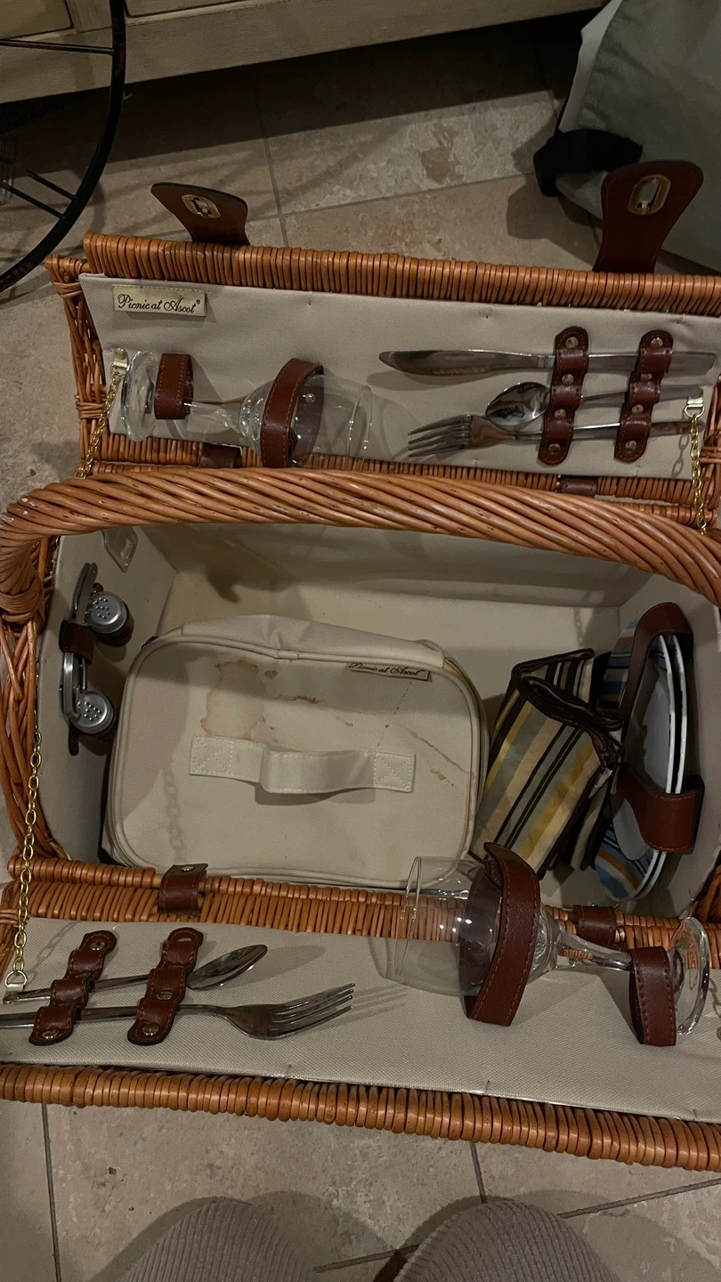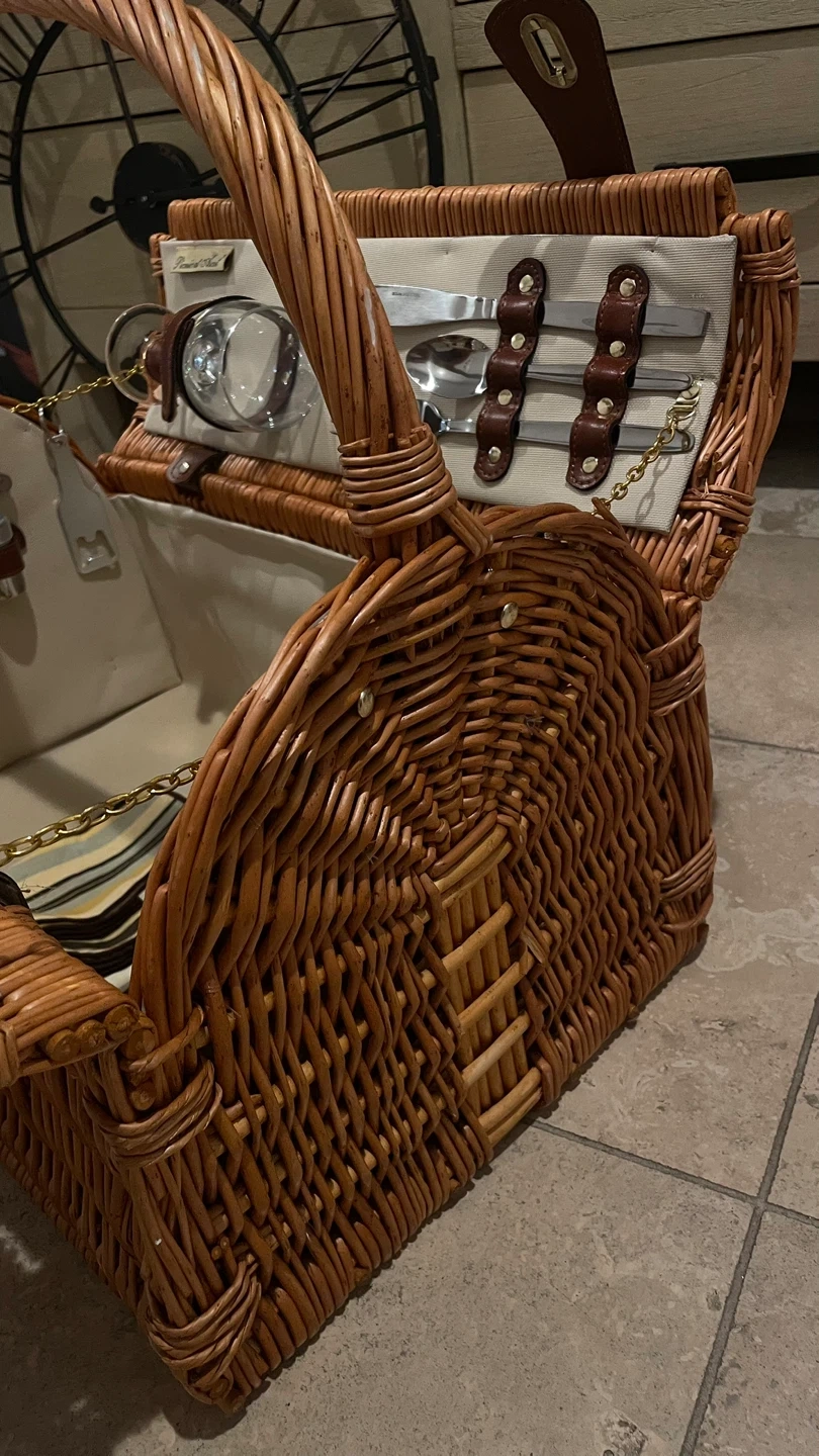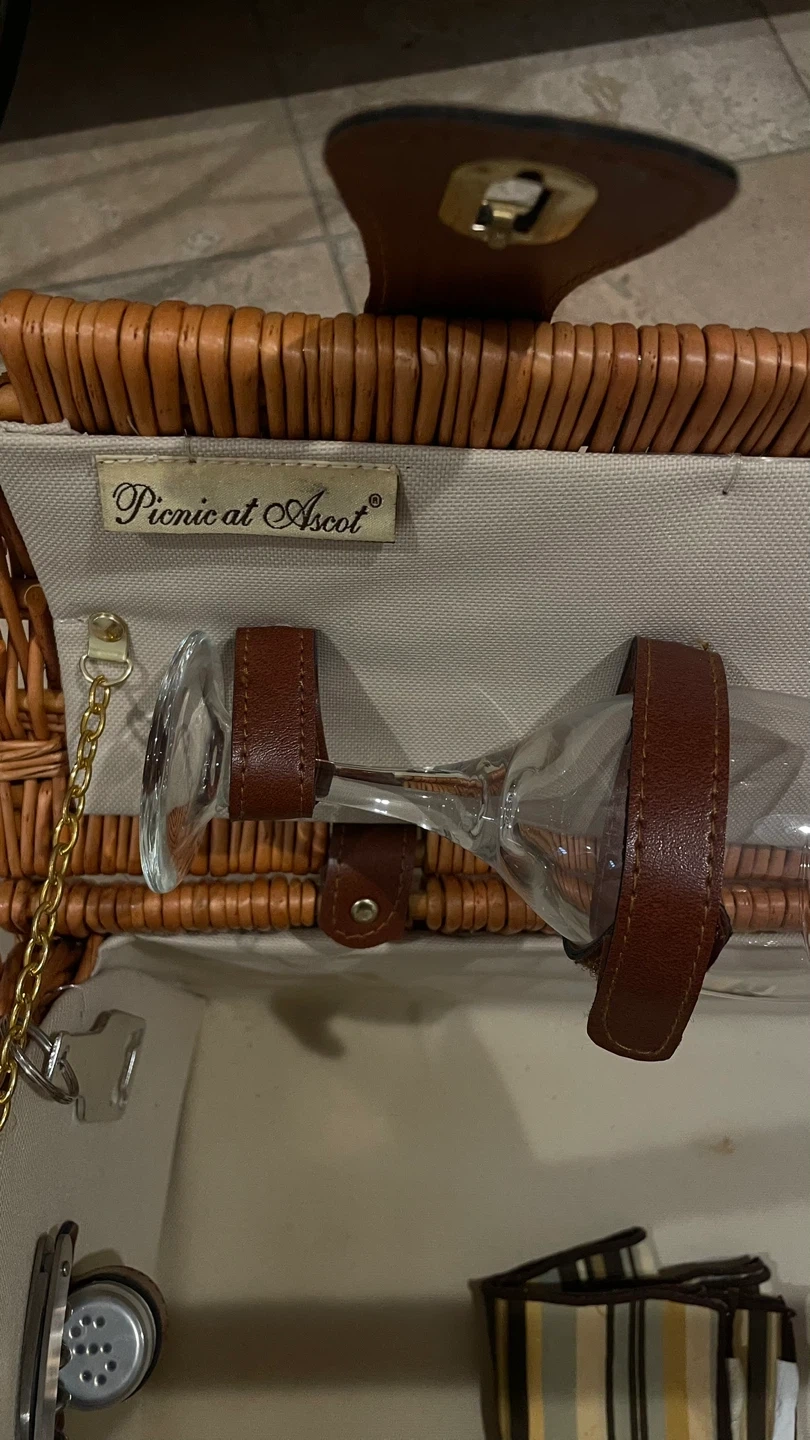 Selling a Picnic at Ascot wicker picnic basket. It has some signs of use, including some stains inside. Includes utensils, glasses, and a cooler bag.