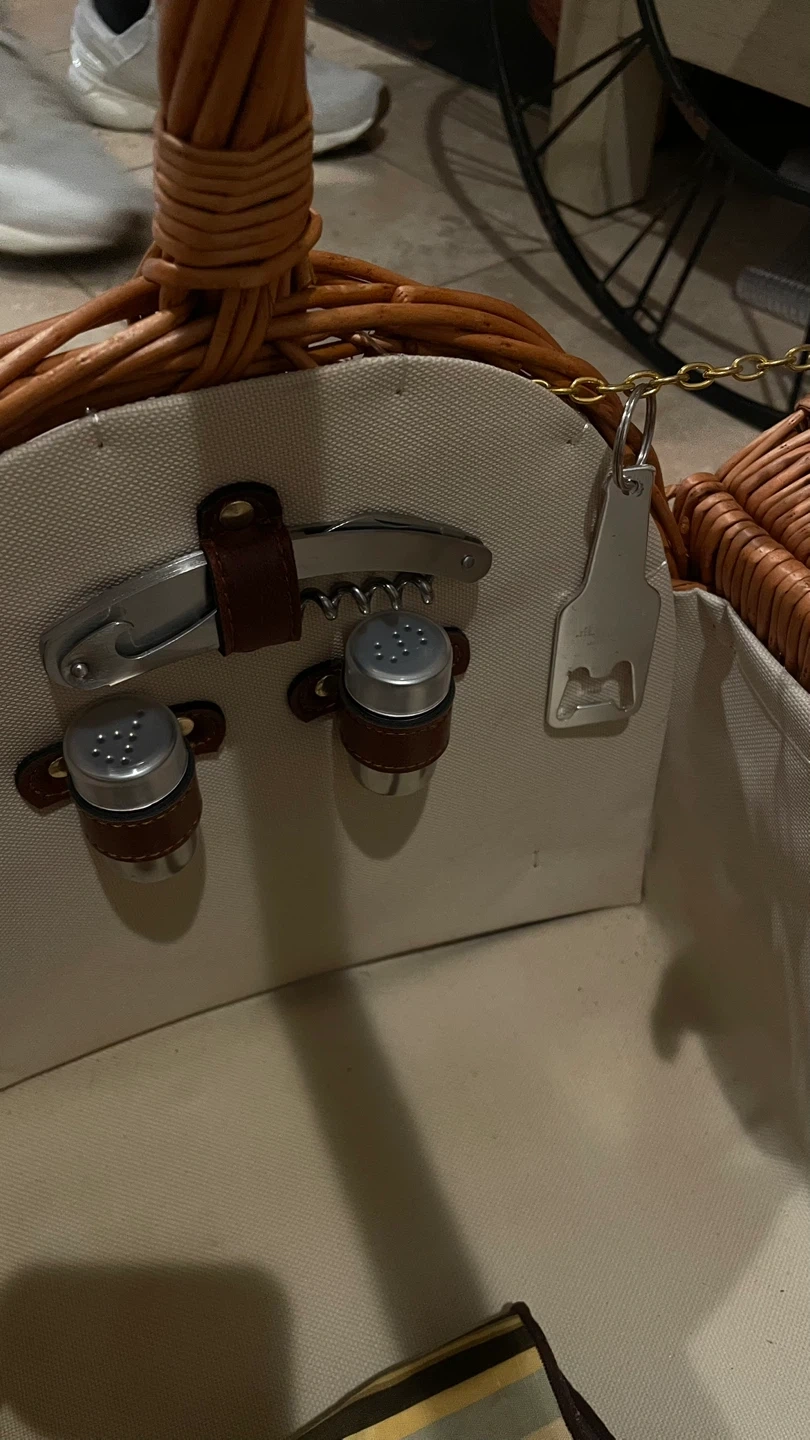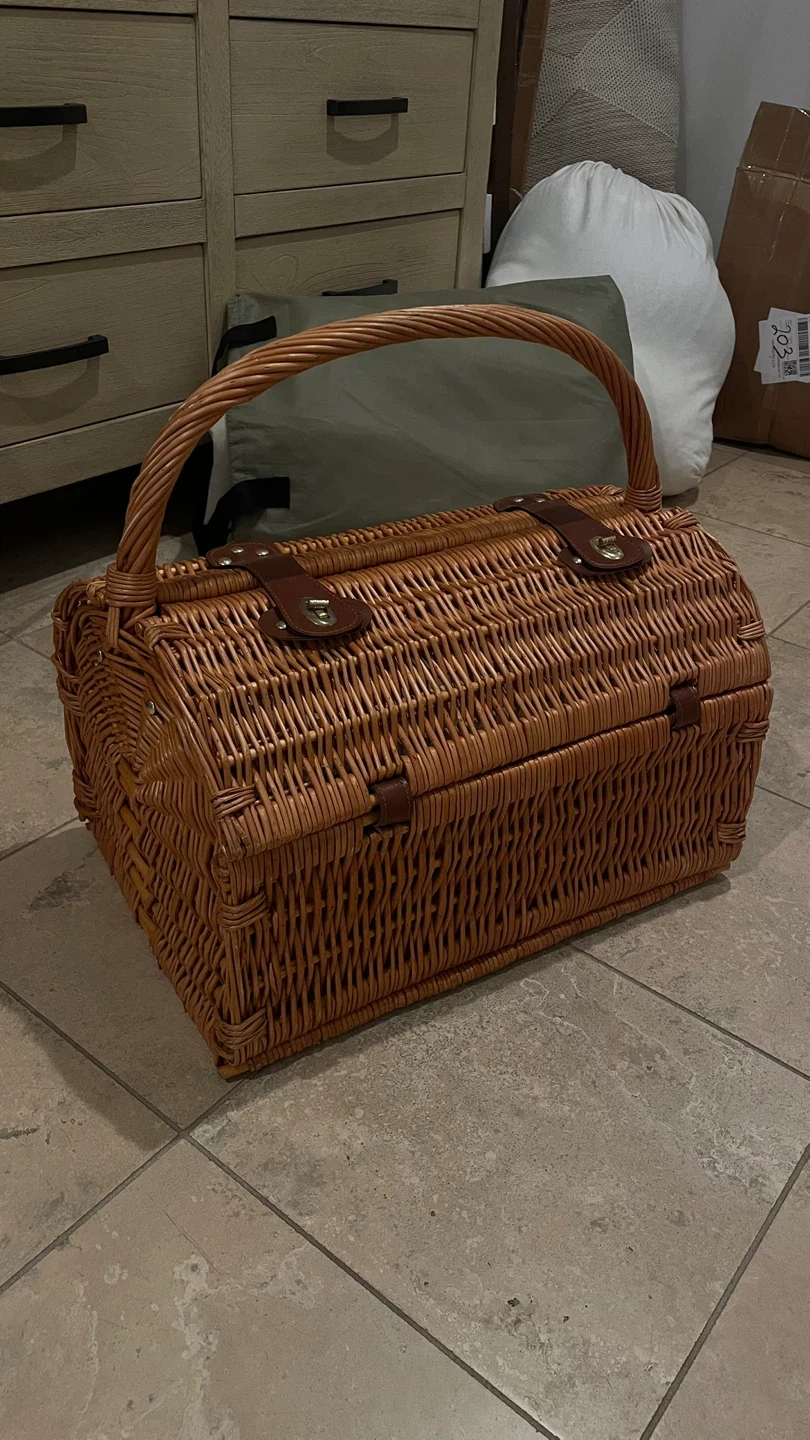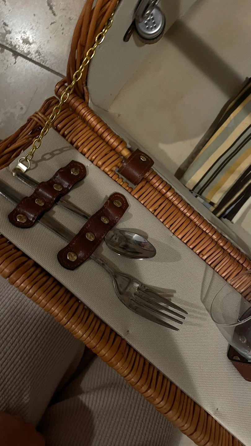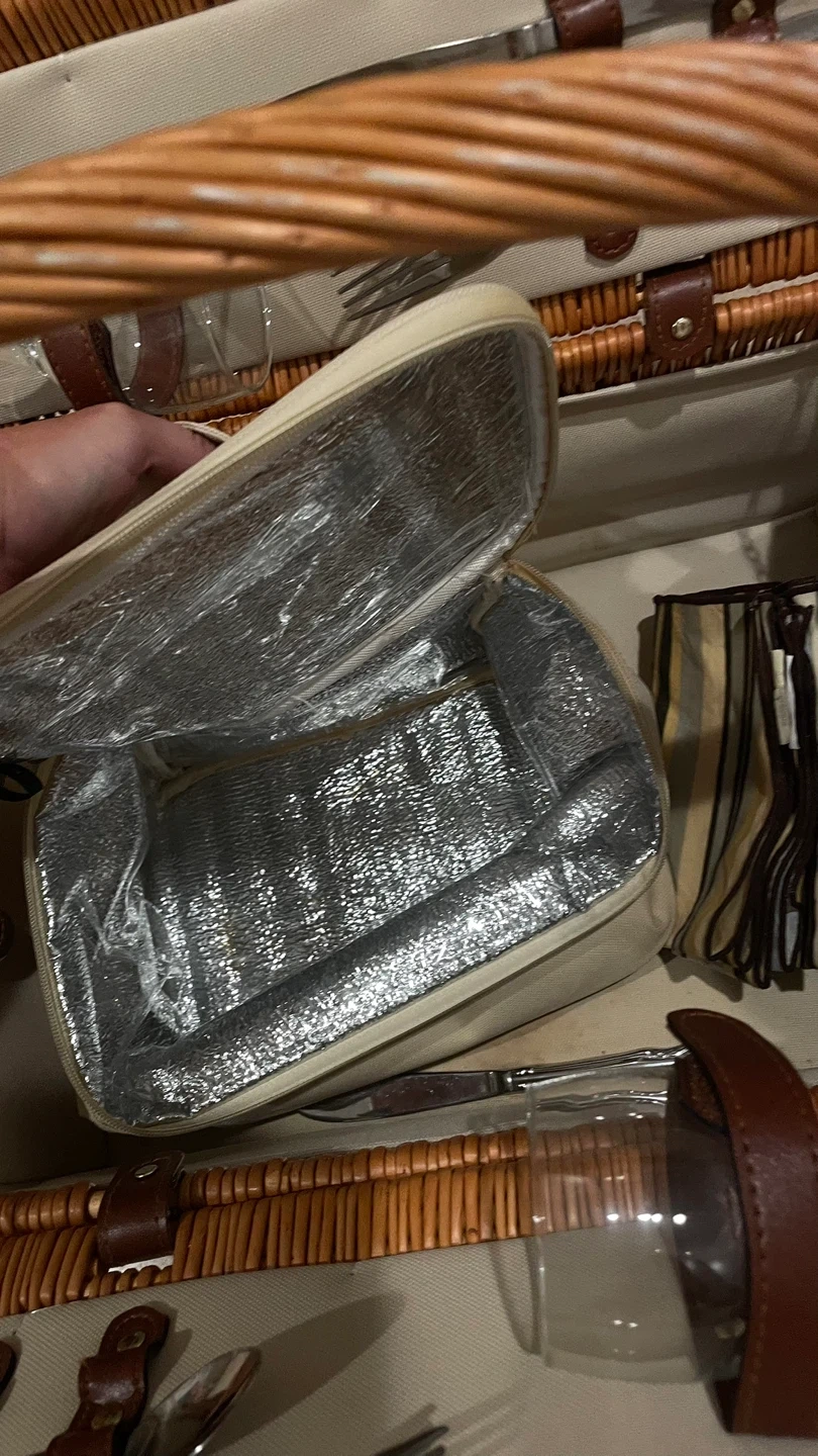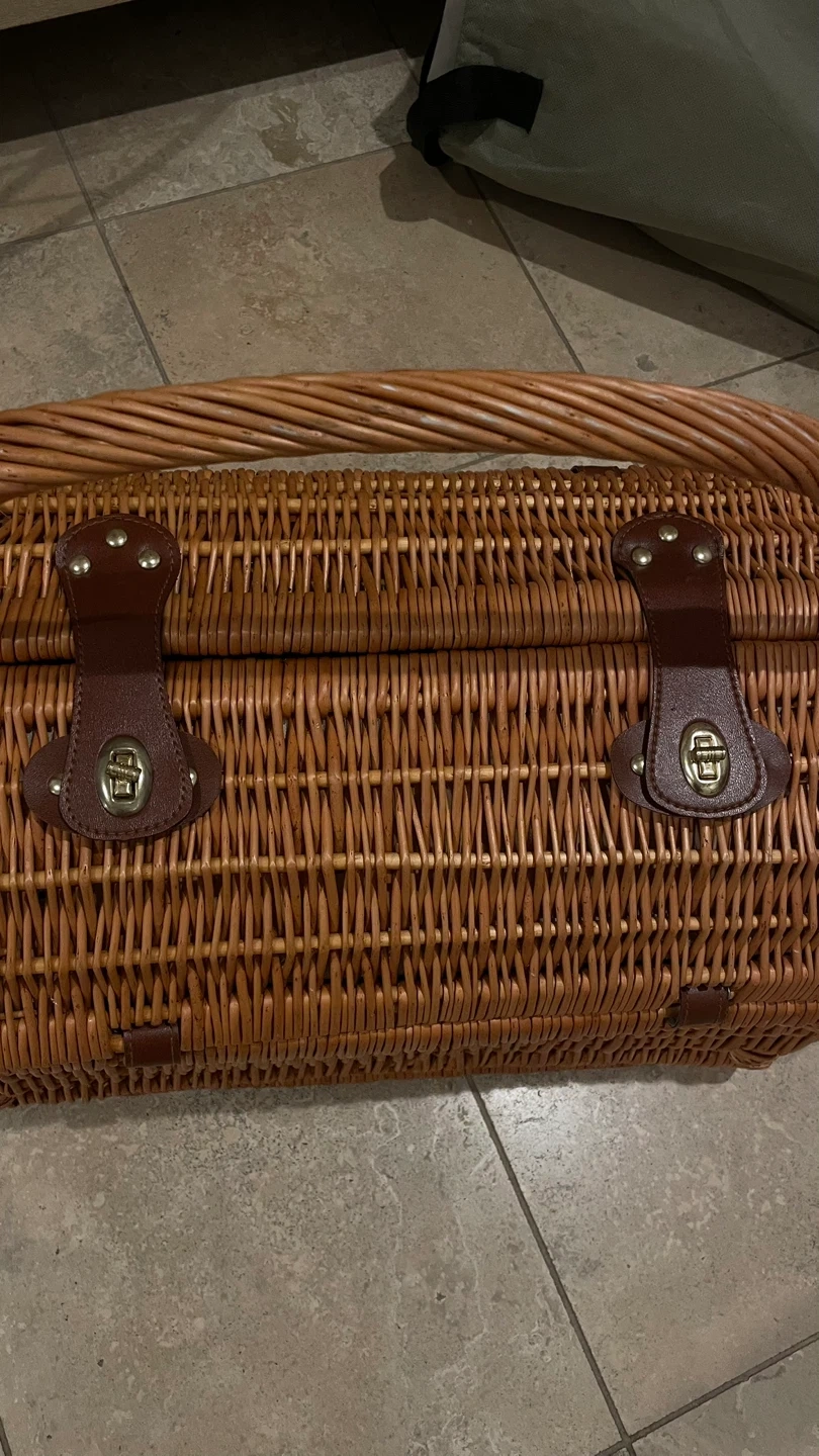 Selling a Picnic at Ascot wicker picnic basket. It has some signs of use, including some stains inside. Includes utensils, glasses, and a cooler bag.