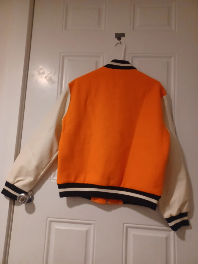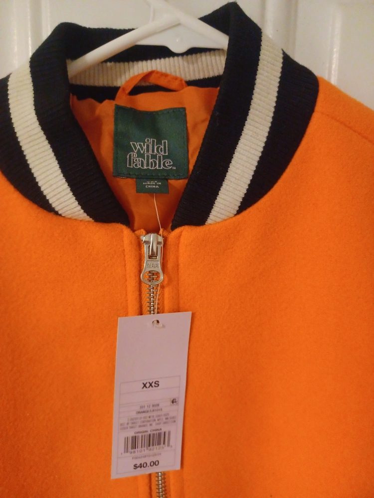 Selling a Wild Fable varsity jacket in size XXS! It's a vibrant orange color with cream-colored sleeves and black and white striped trim. The jacket is in great condition and originally cost $40 This garment is unisex