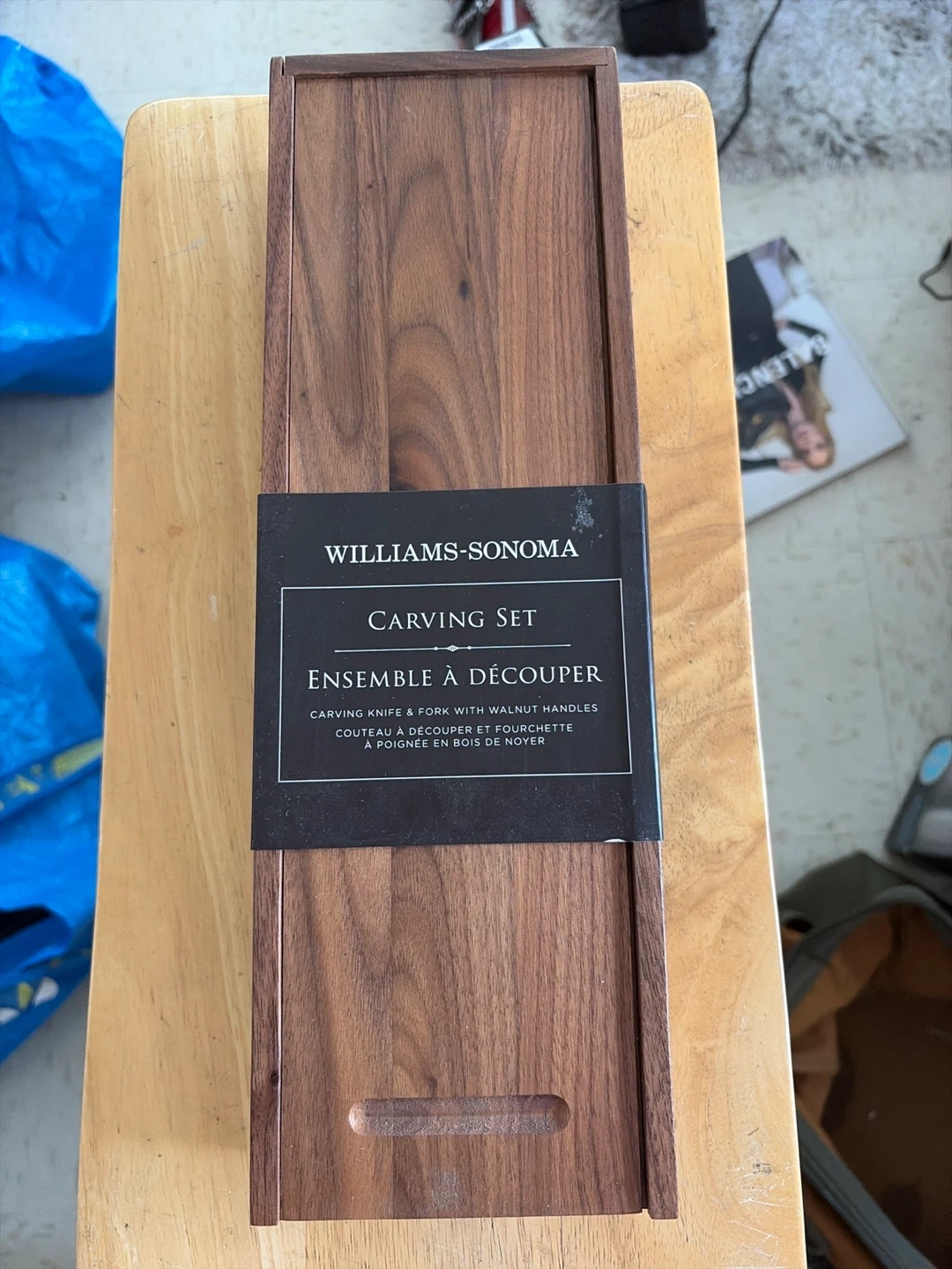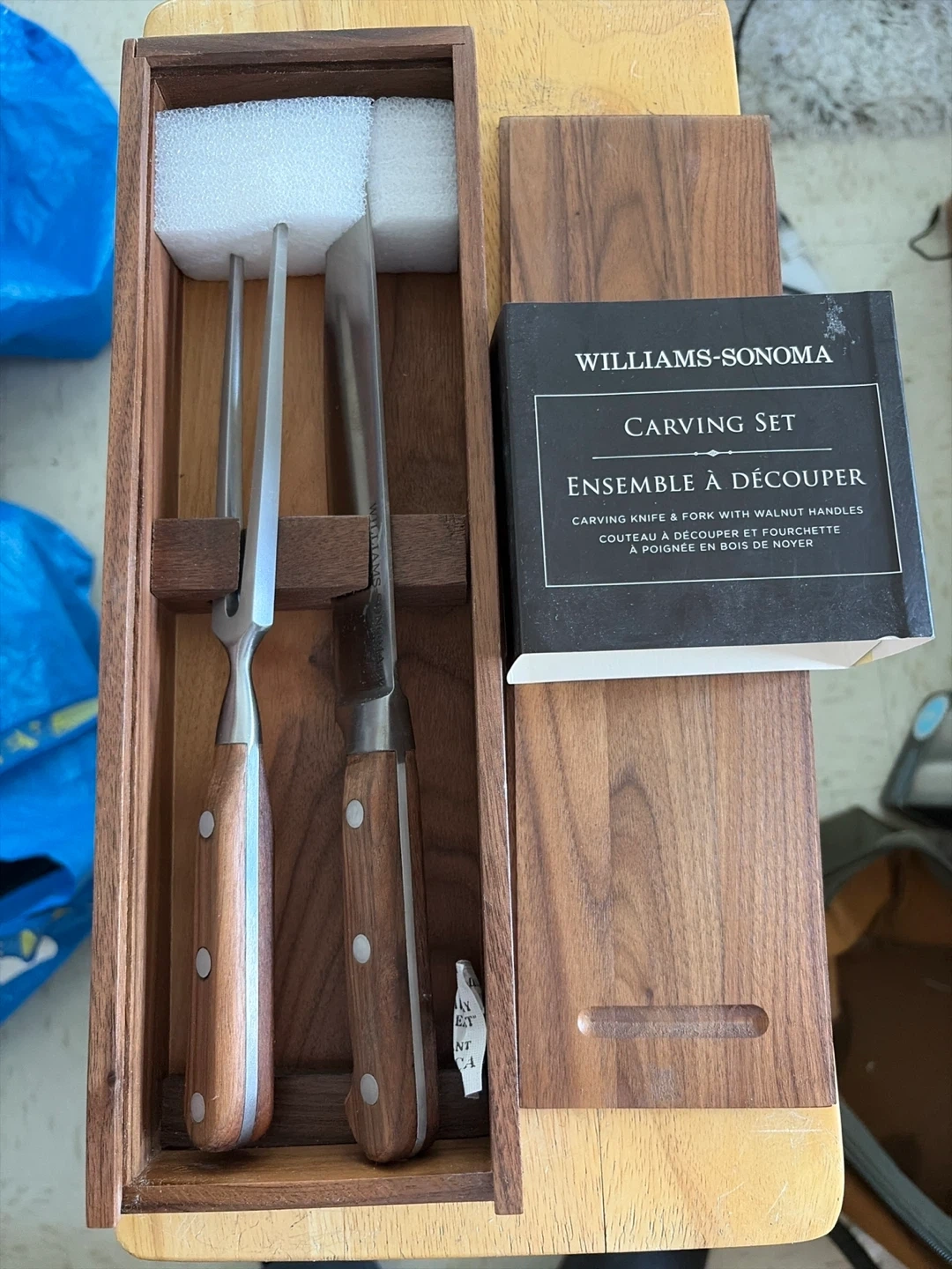 Selling a Williams Sonoma Carving Set. It includes a carving knife and fork with walnut handles. The set comes in its original wooden box.