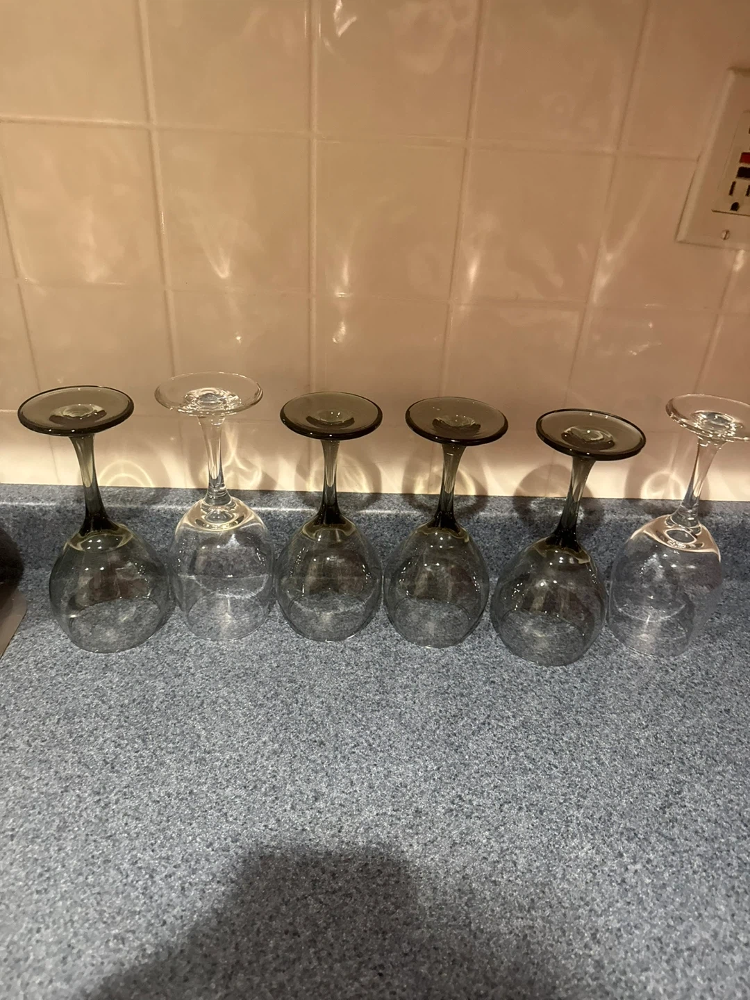 Selling a set of six wine glasses. They have a clear glass body with a dark gray stem and base. Two of the glasses are clear, while the other four have the gray stem and base.