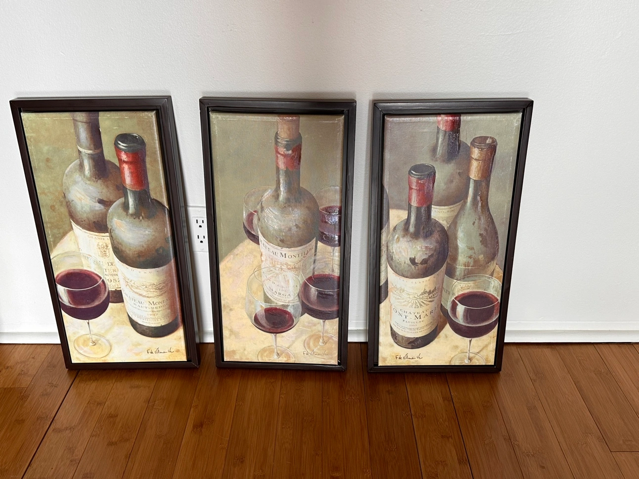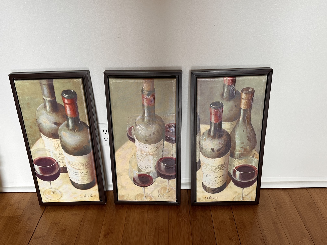 Three wine pictures- acrylic in very good condition. Perfect for dining room decor or wine cellar