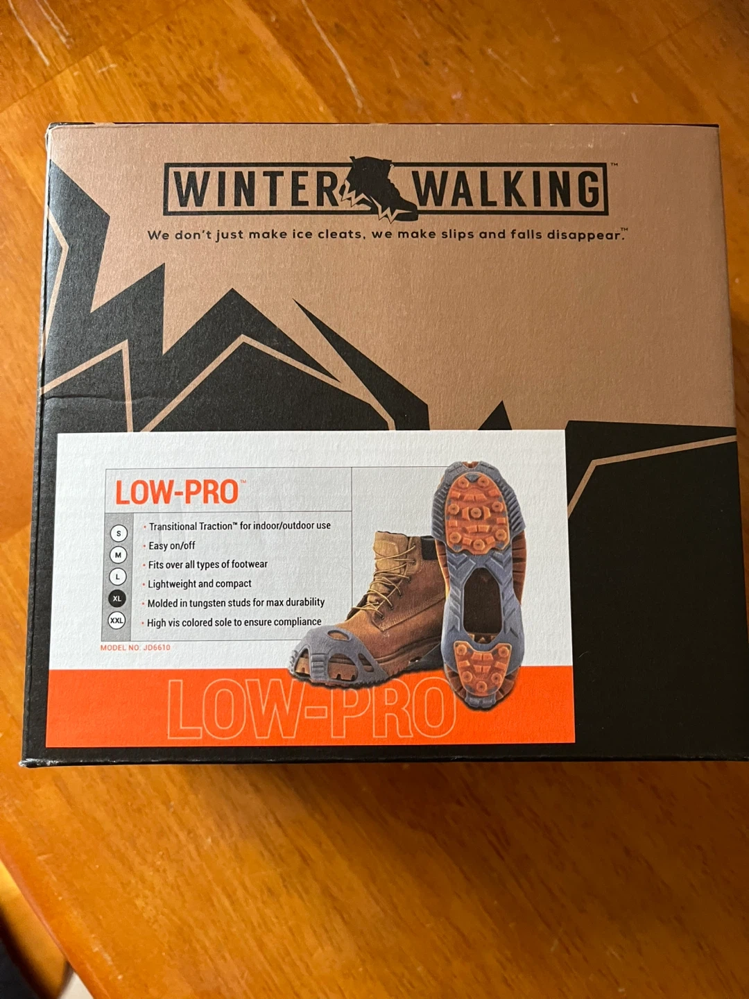 Selling a brand new pair of Winter Walking Low-Pro ice cleats, still in the original box! These are great for transitional traction for indoor/outdoor use and are easy to put on and take off. - Lightweight and compact - Molded tungsten studs for max durability - High vis colored sole to ensure compliance