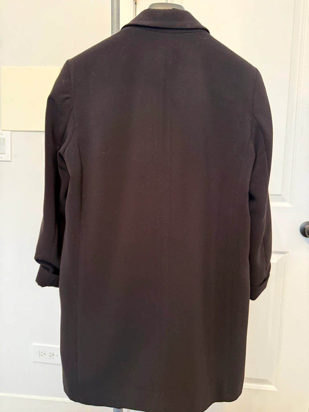 Classic longline blazer in black with lapel collar, fully lined, and front pockets. Versatile for work or casual outfits. Excellent condition (5/5).