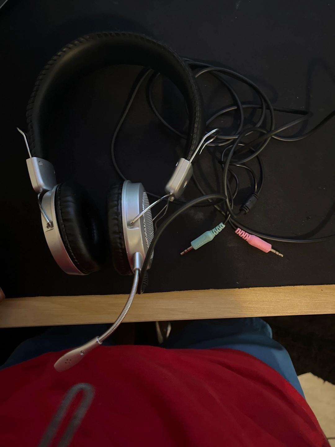 Selling a wired headset. It comes with a microphone and has separate pink and green audio jacks. Perfect for online meetings! Or for playing games.