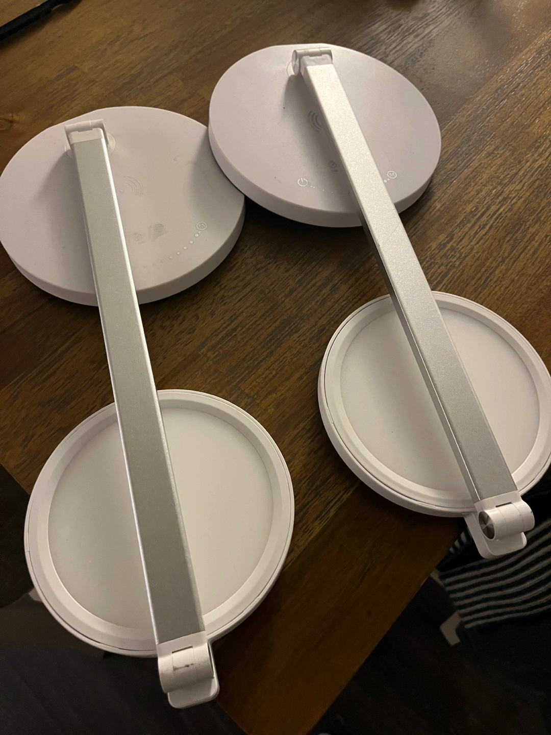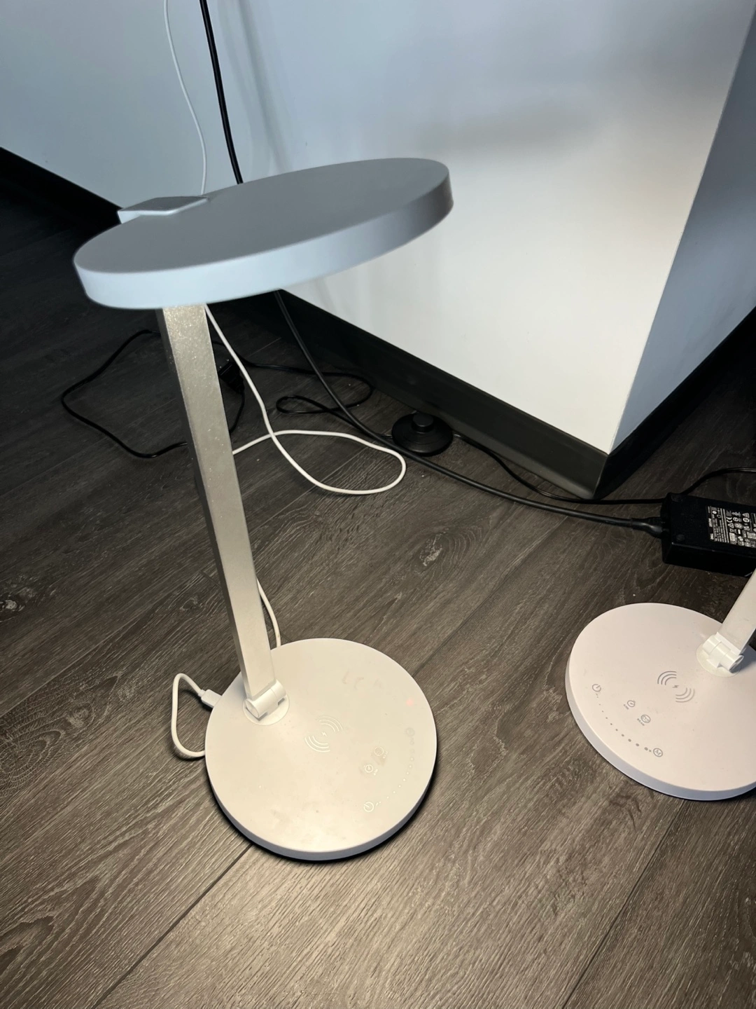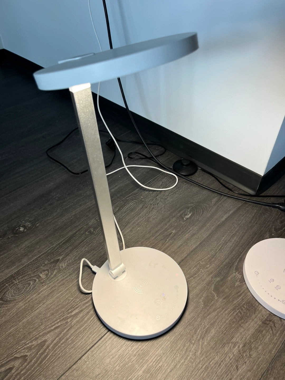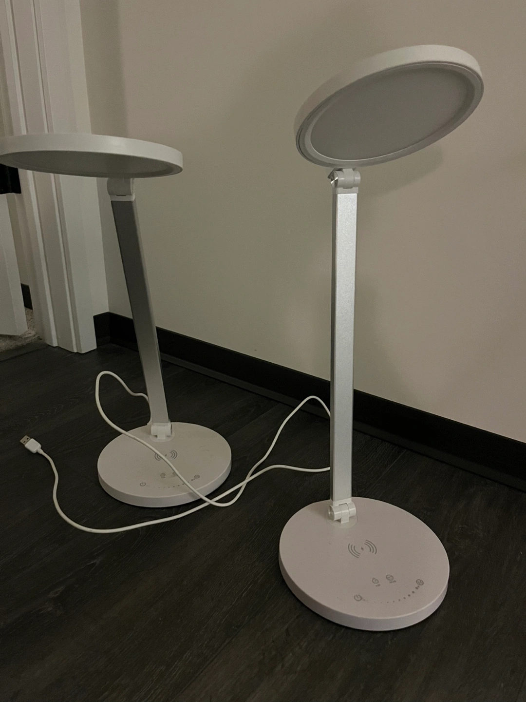 Pair of modern desk lamps. Sleek design. Wireless charging capabilities. Adjustable height. USB powered. Has both Fluorescent and mood lighting!