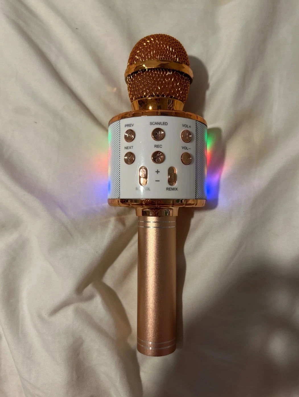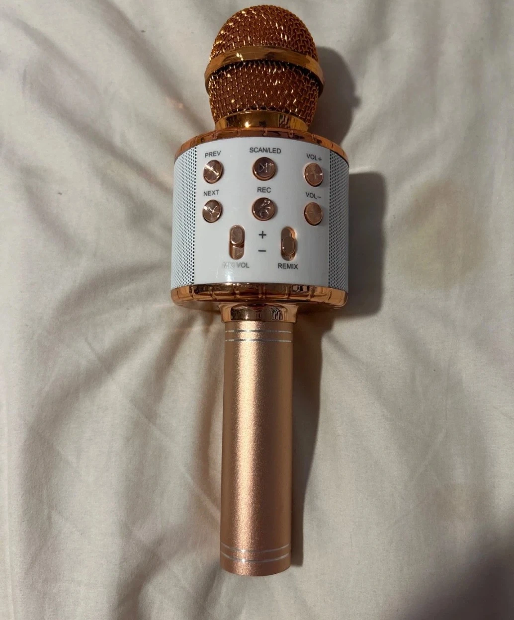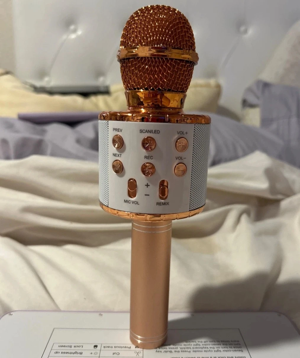 15Selling a wireless karaoke microphone in rose gold. It has buttons for PREV, NEXT, SCAN, REC, VOL+, VOL-, MIC VOL, and REMIX. Perfect for some karaoke fun! Sing your heart out anywhere with this Bluetooth karaoke microphone rose, gold color, built-in speaker. connects via Bluetooth to your phone or any device rechargeable with USB cable. Works great, perfect for parties, karaoke sleepovers, or TikTok videos lightly used fully functional and super clean. Price negotiable