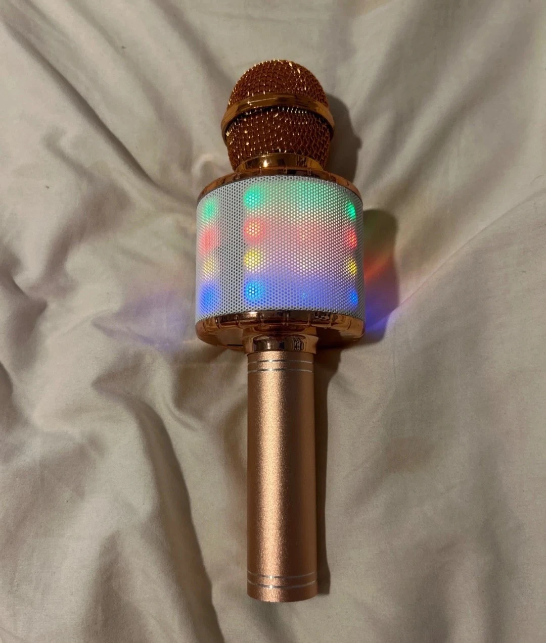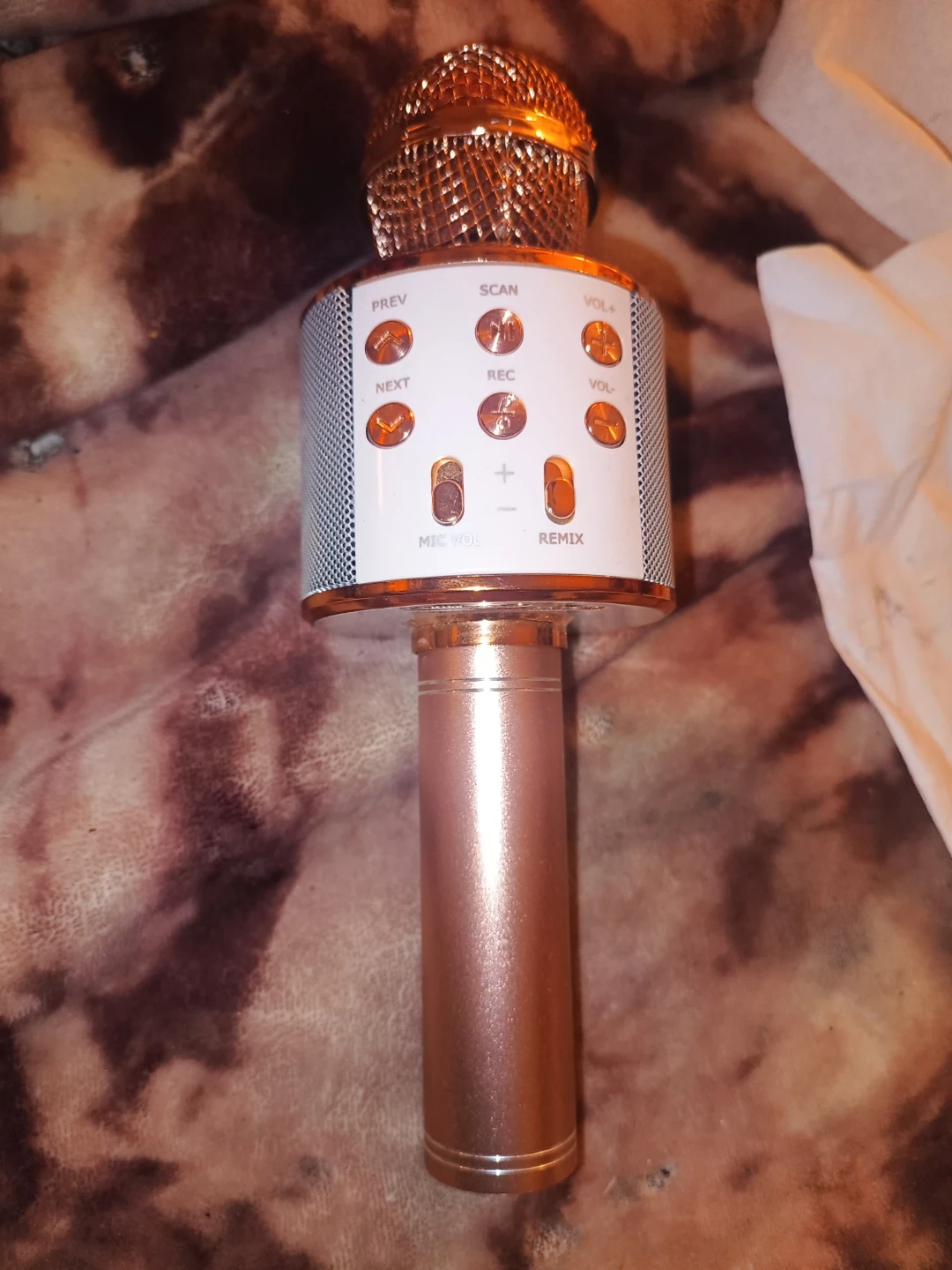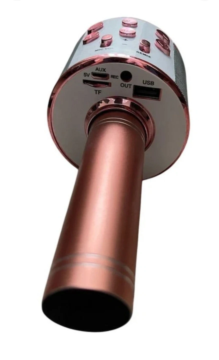 15Selling a wireless karaoke microphone in rose gold. It has buttons for PREV, NEXT, SCAN, REC, VOL+, VOL-, MIC VOL, and REMIX. Perfect for some karaoke fun! Sing your heart out anywhere with this Bluetooth karaoke microphone rose, gold color, built-in speaker. connects via Bluetooth to your phone or any device rechargeable with USB cable. Works great, perfect for parties, karaoke sleepovers, or TikTok videos lightly used fully functional and super clean. Price negotiable