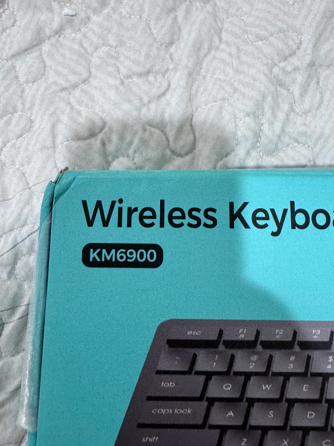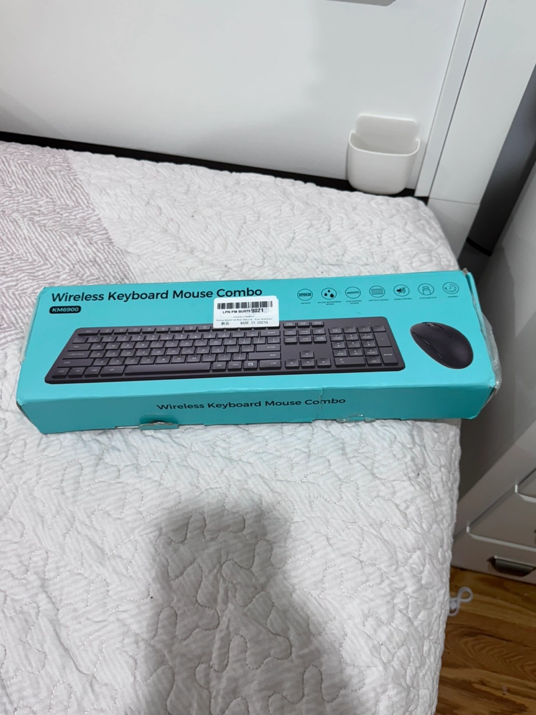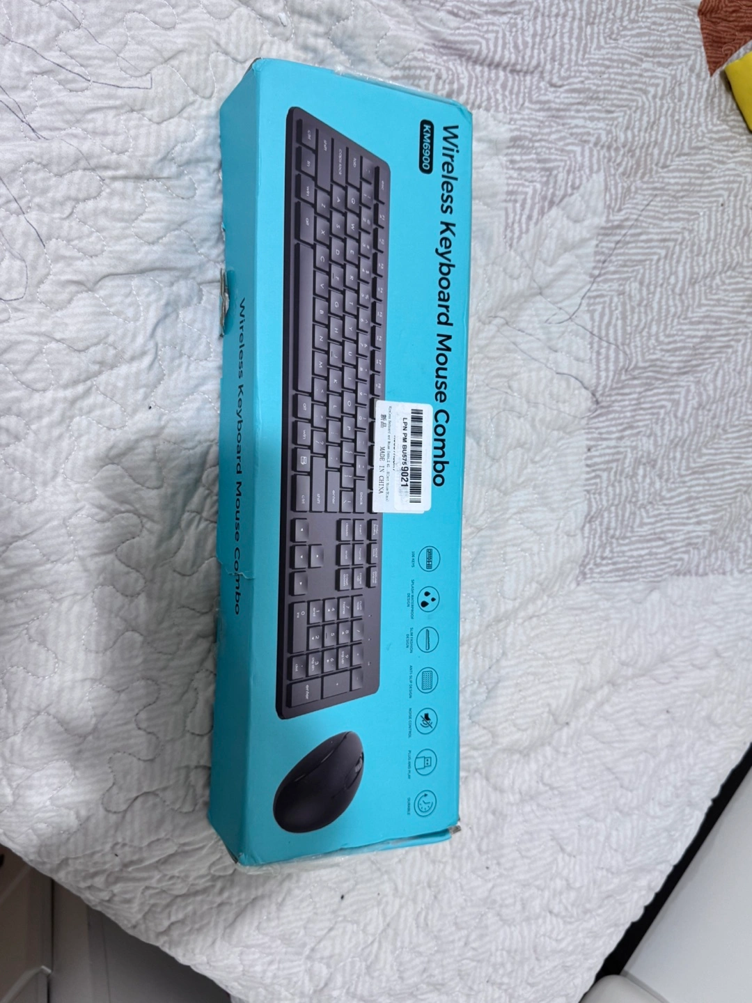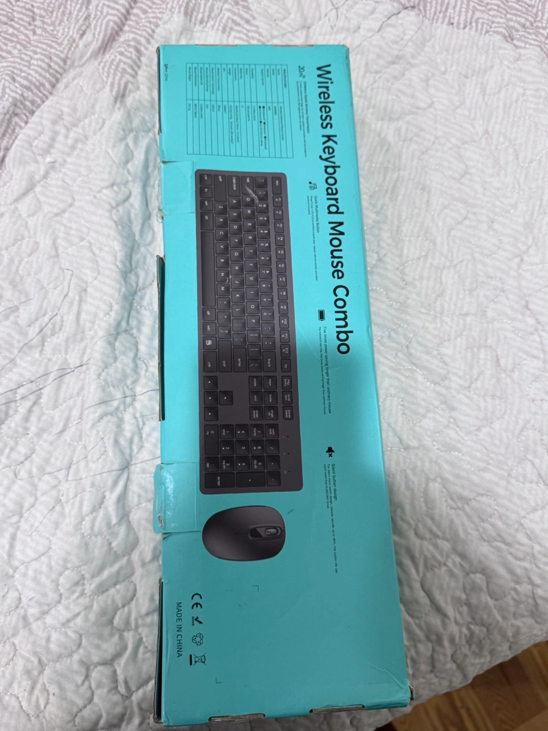 The keyboard and mouse are wireless. They are in a box. The keyboard has several keys. Use it at your desk to help you relax.
